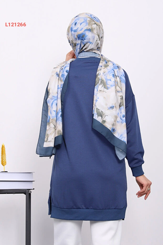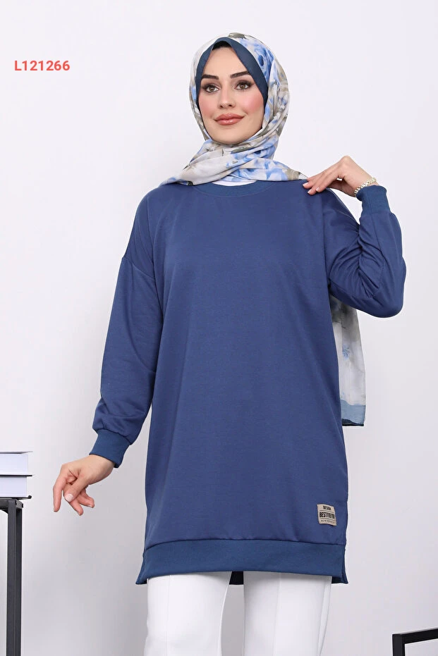 تي شيرت تونك بكم طويل بلون أزرق داكن مع خياطة شبابية