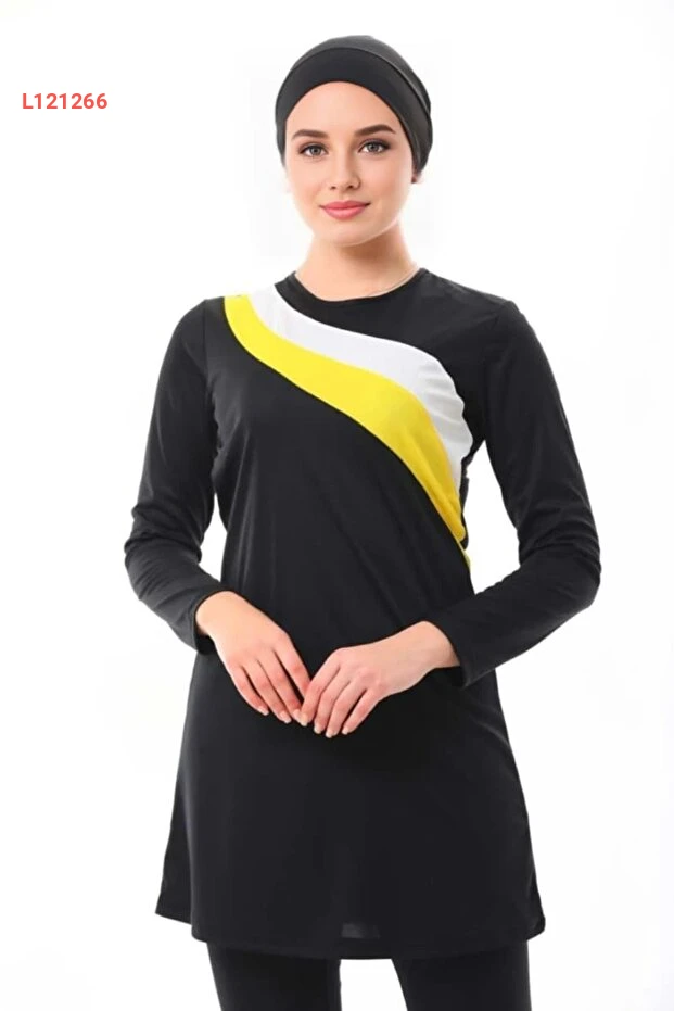 اجعل إطلالتك الصيفية مميزة مع مايو إنسي الأصفر بشريطه الأنيق! يتميز هذا التصميم الطويل الأكمام بجودة عالية ومرونة رائعة، مما يضمن لك راحة كاملة أثناء السباحة. كما أنه يأتي بتصميم يغطي الجسم بالكامل، مما يجمع بين الأناقة والاحترام لمواصفات الموضة المحتشمة.