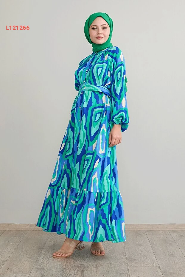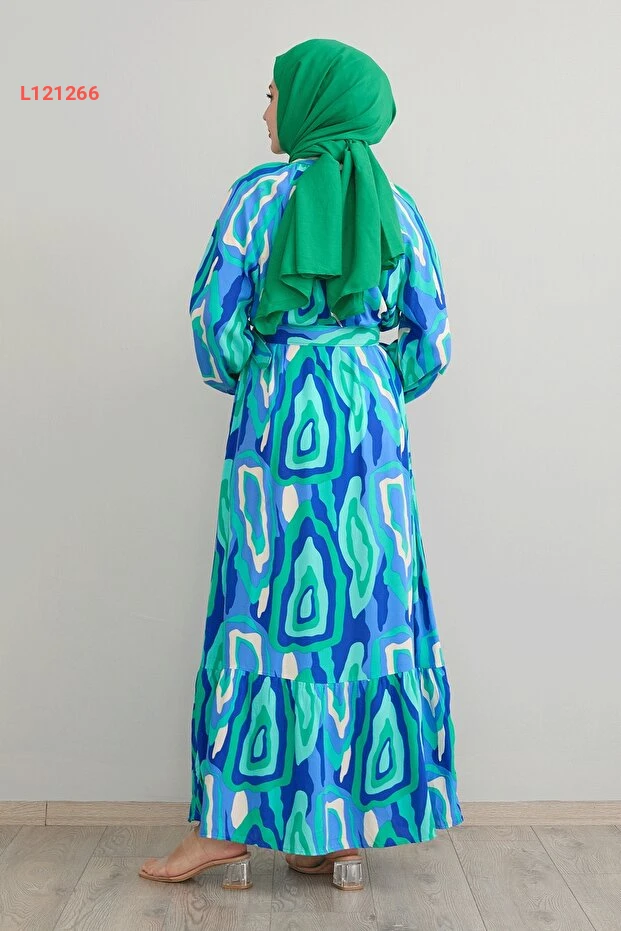فستان فيسكوز أخضر مزين بشريط بيضاوي