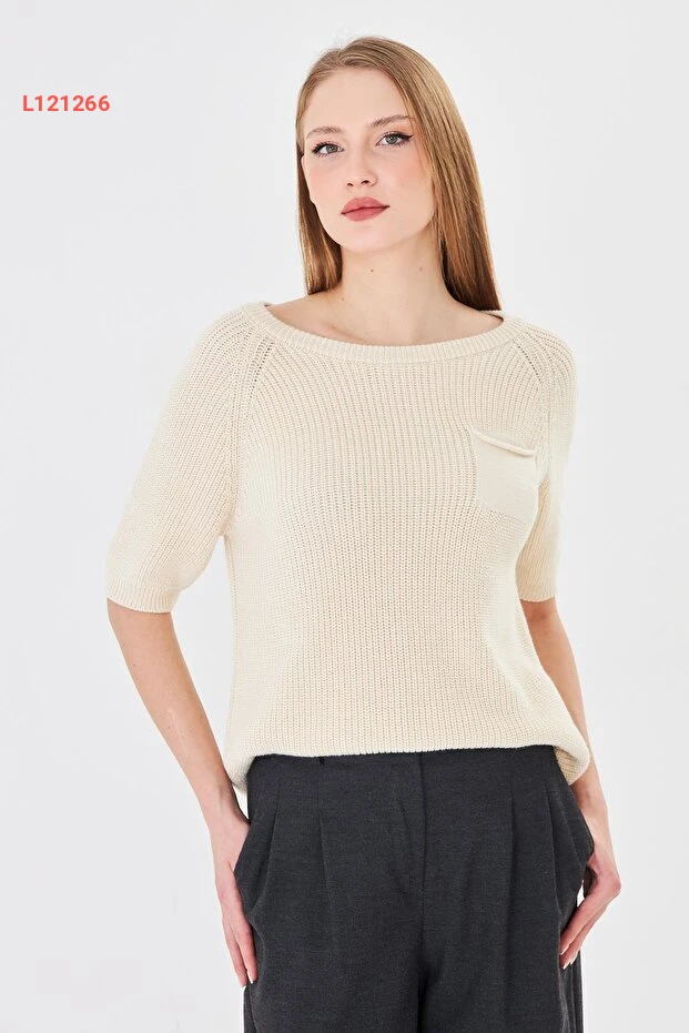 بلوزة صيفية نسائية من القطن الخالص بتصميم قارب الأكتاف وكسرات قصيرة - لون بيج