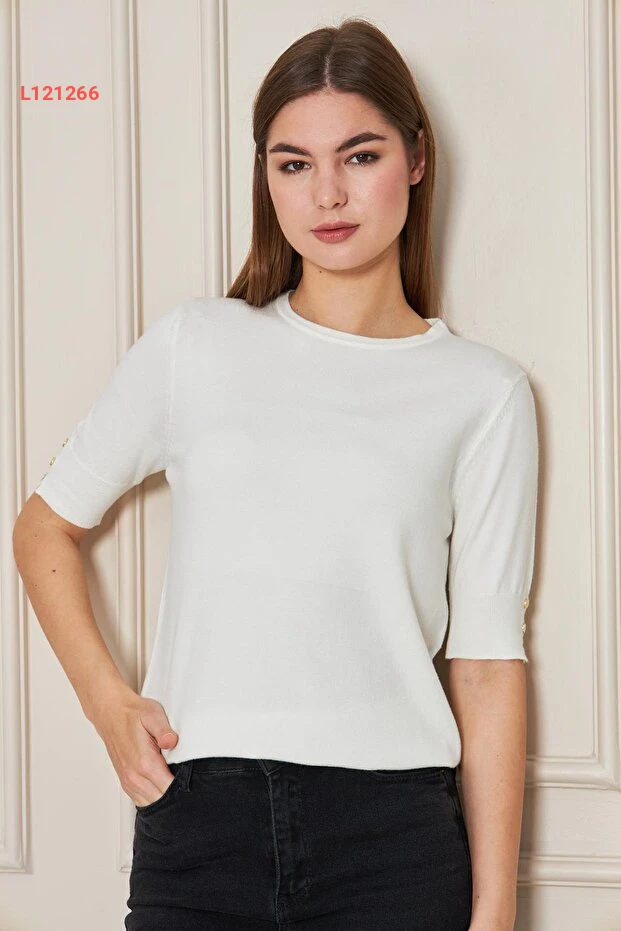 بلوزة تريكو قصيرة الأكمام مزودة بأزرار نسائية من إيرماك - لون إكرو