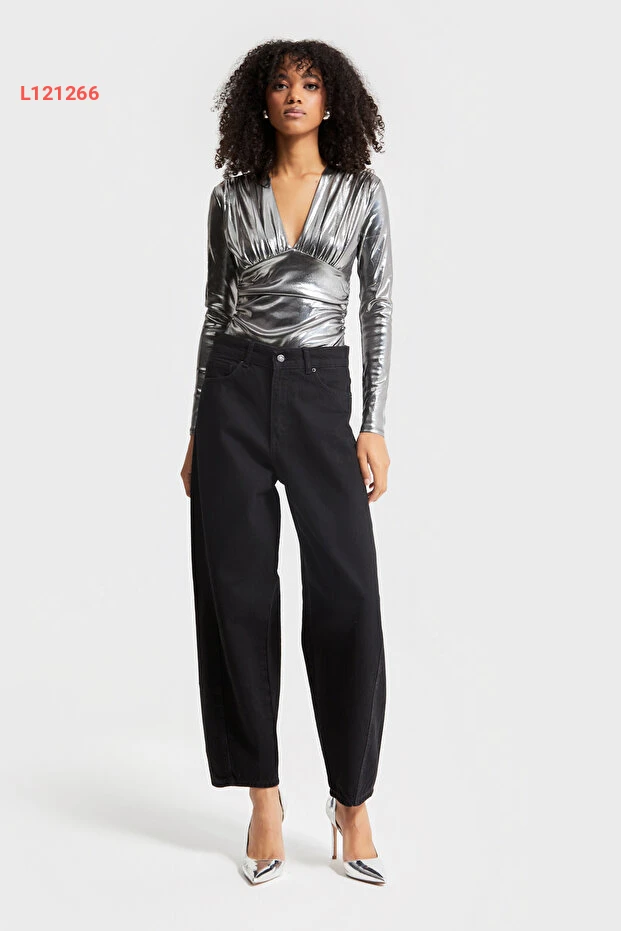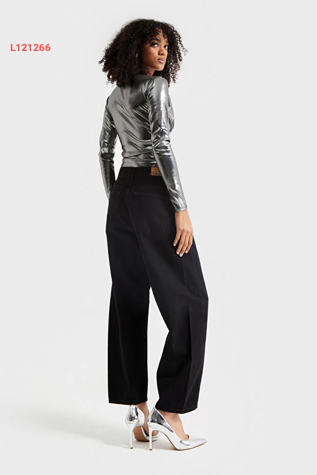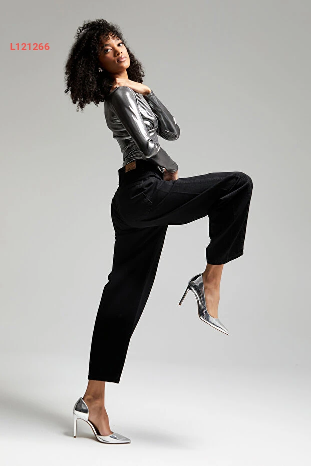 جينز دينيم عالي الخصر بقصة جزرية مريحة للنساء - أسود
