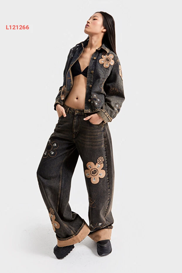 الجينز الدنيم النسائي المطرز بالأزهار بتصميم واسع ولون بندقي 4w5-87