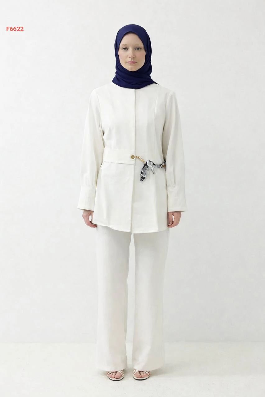جاكيت مع حزام جانبي بتفاصيل فولار