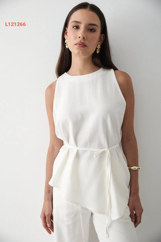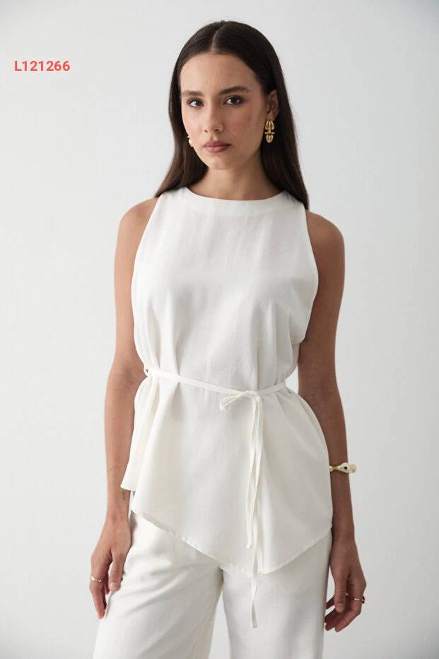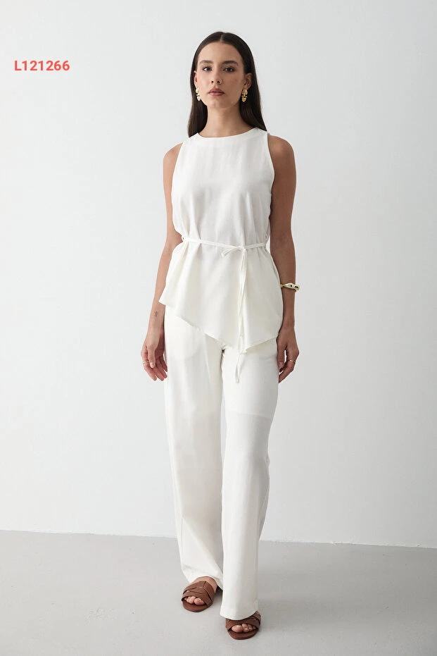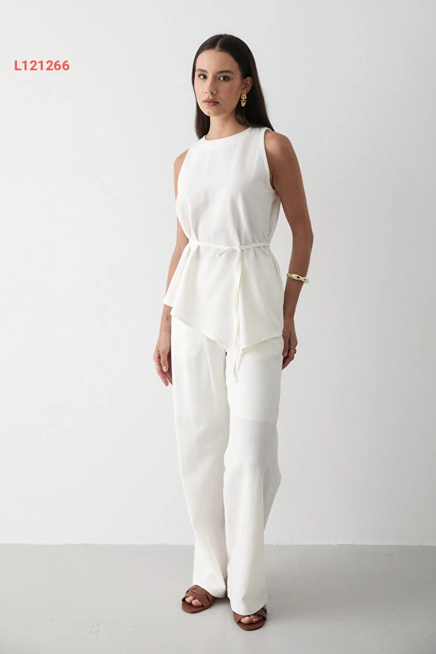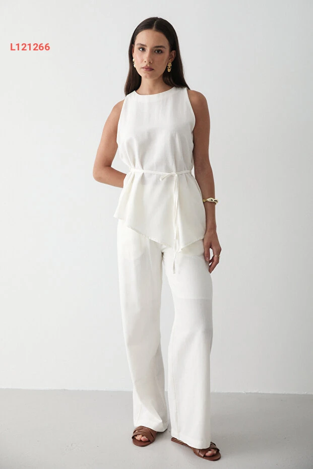 مجموعة سروال وست من الكتان الإكروي للنساء مع ياقة دائرية