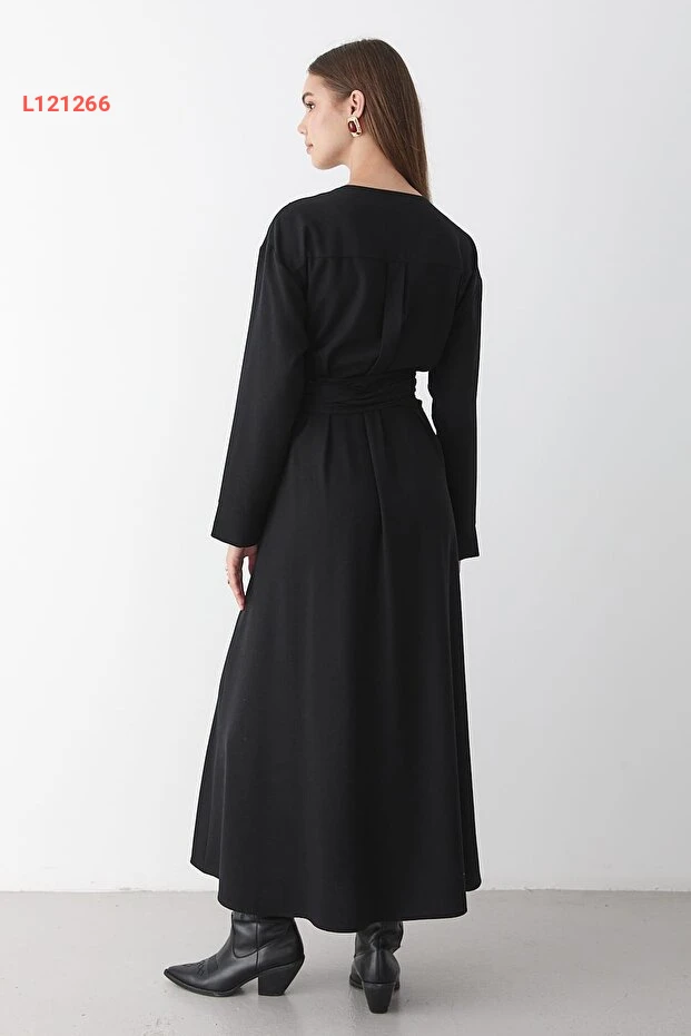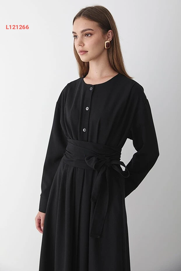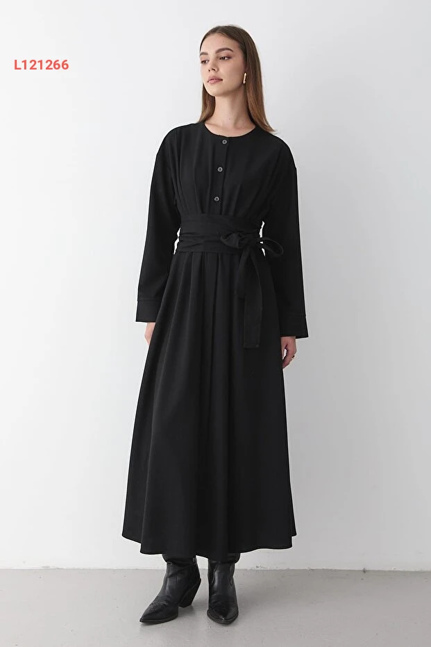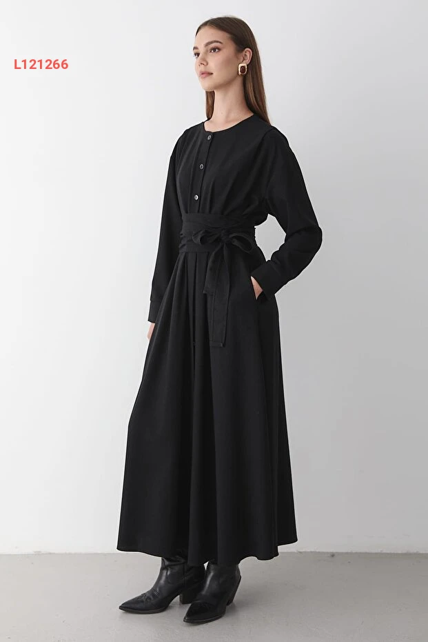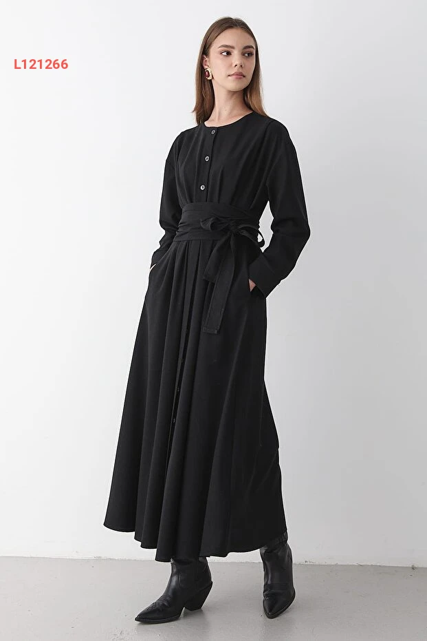 استمتعي بأناقتك مع فستان JASTE الأسود الطويل، المصنوع من خامات عالية الجودة مع تفاصيل زرية أنيقة وحزام عند الخصر لتحديد الشكل. مثالي للإطلالات المتنوعة، يجمع هذا الفستان بين الراحة والأنوثة، مما يجعله خيارك المثالي لكل المناسبات.