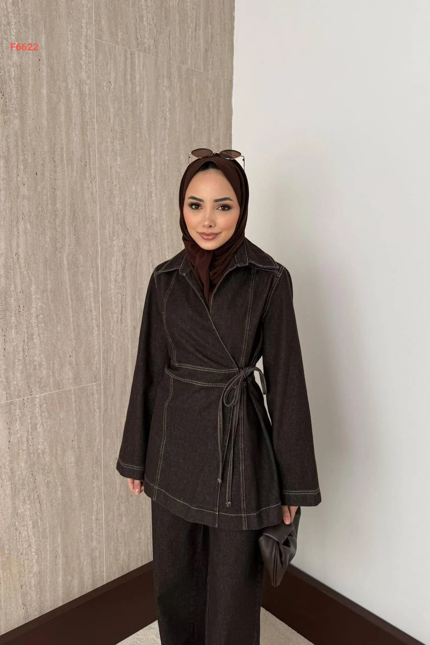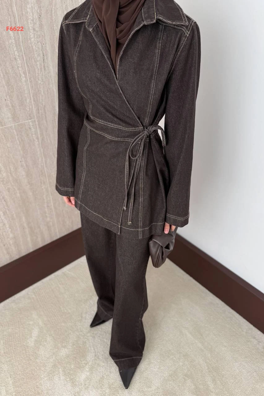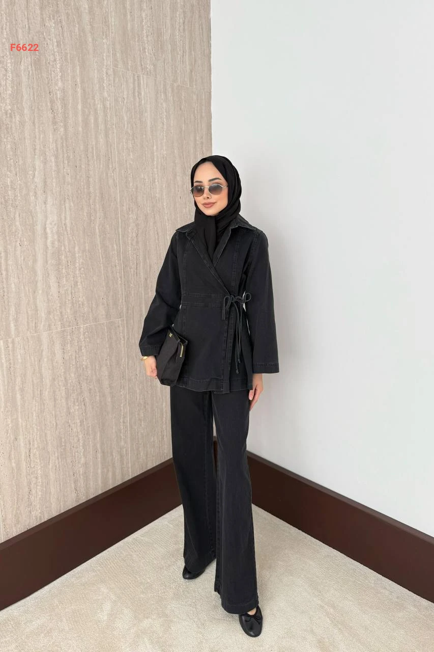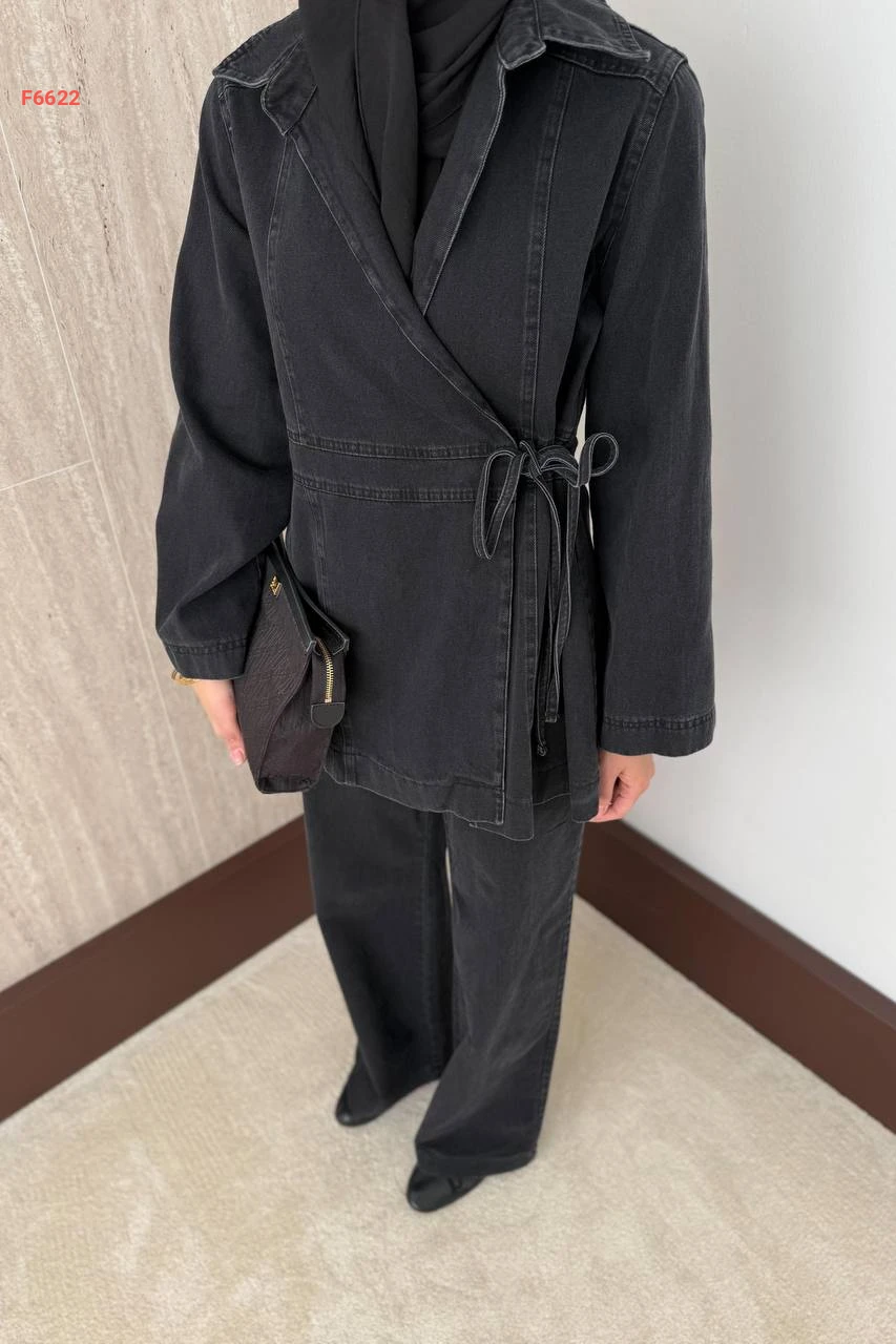 طقم بنطال جينز وجاكيت لف بربطة