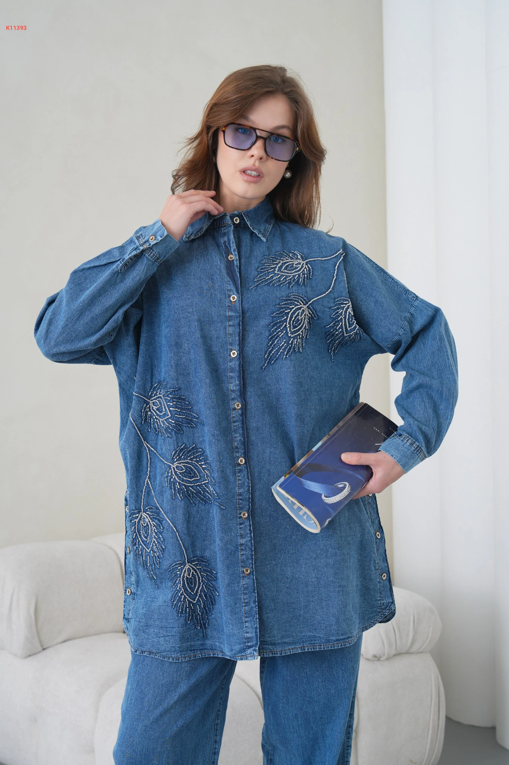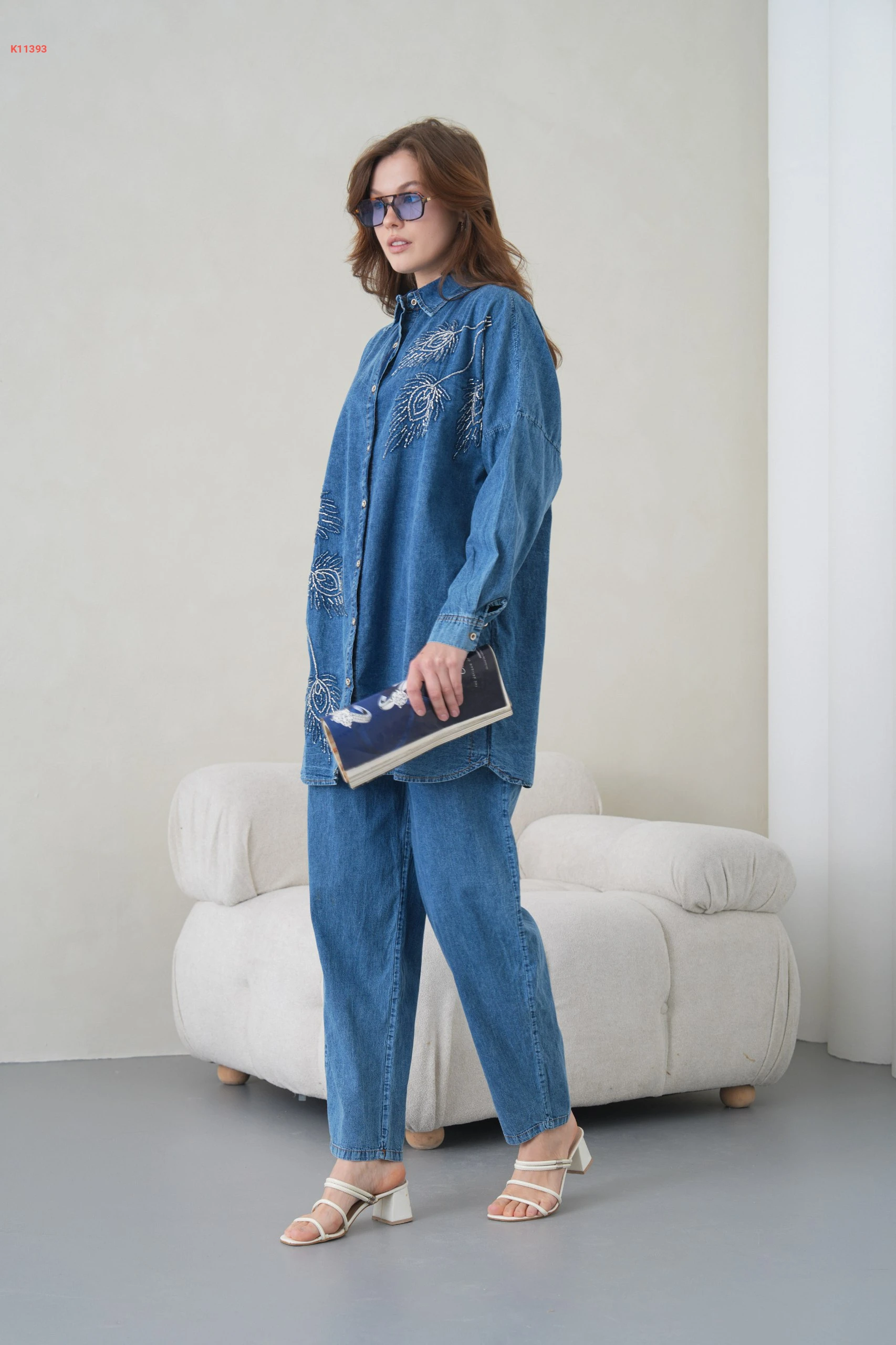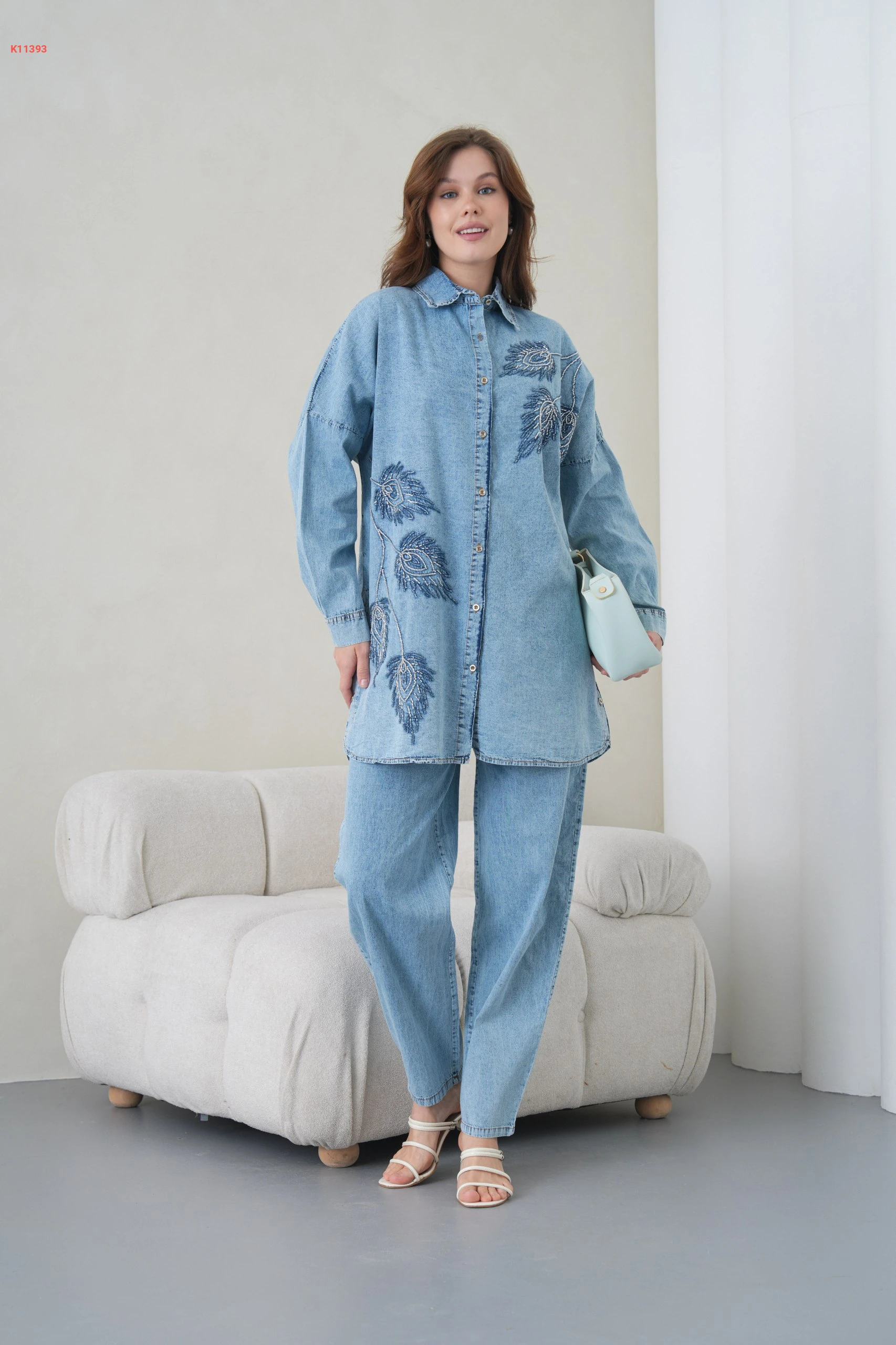 طقم بنطال جينز وقميص مطرز