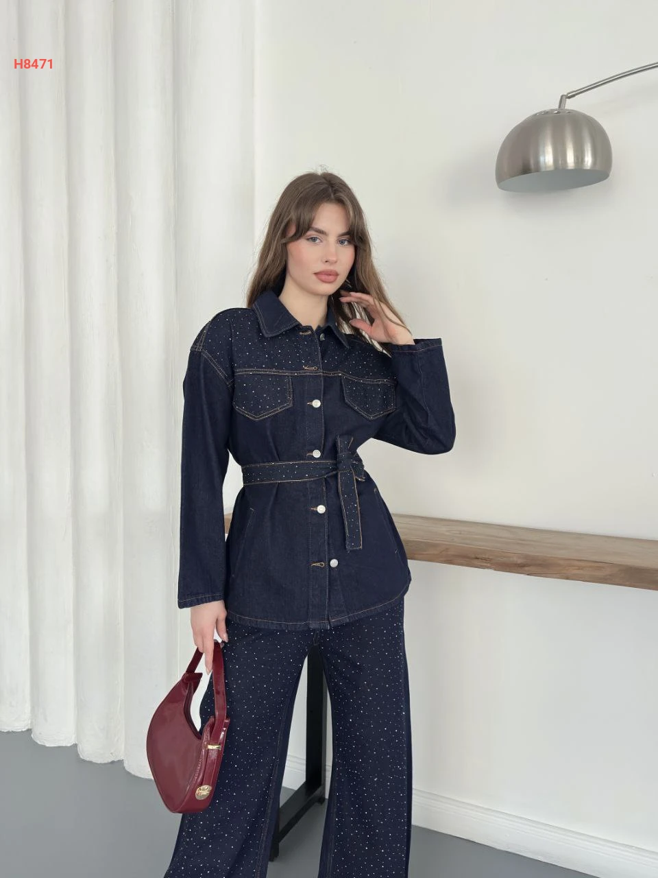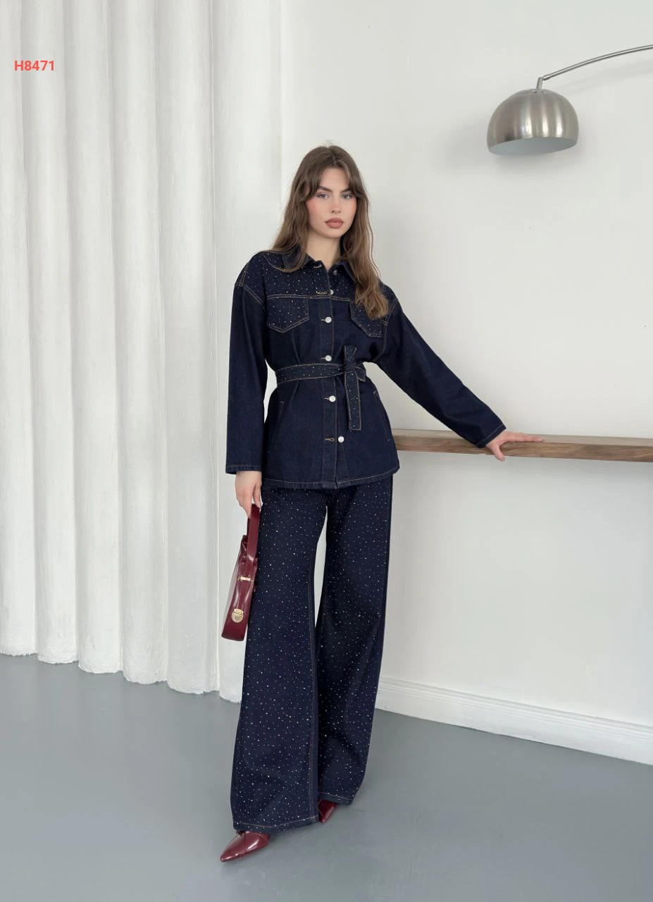 طقم بنطال جينز وجاكيت بتفاصيل حجرية