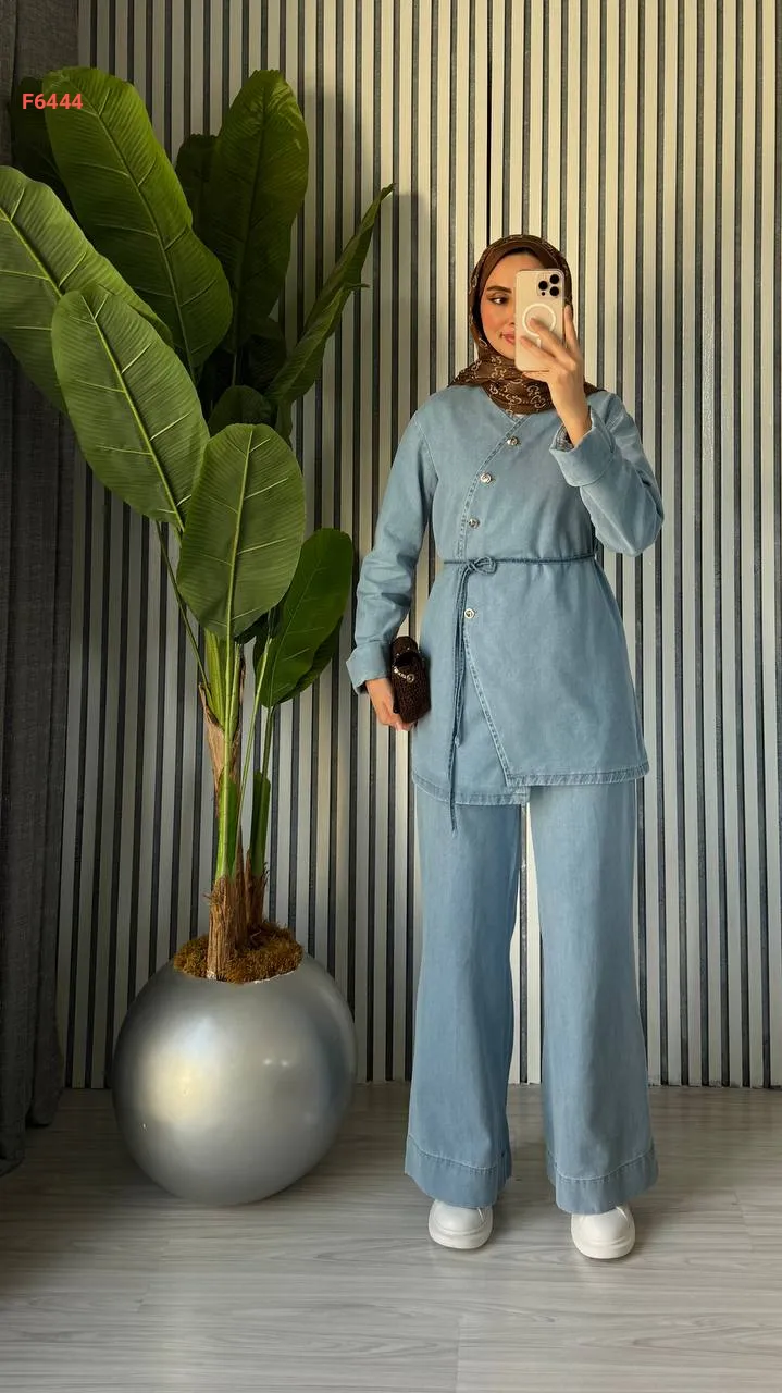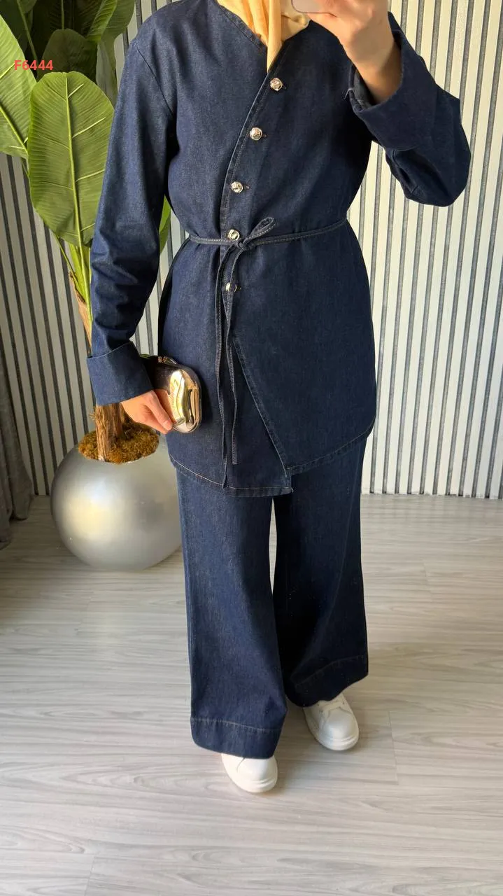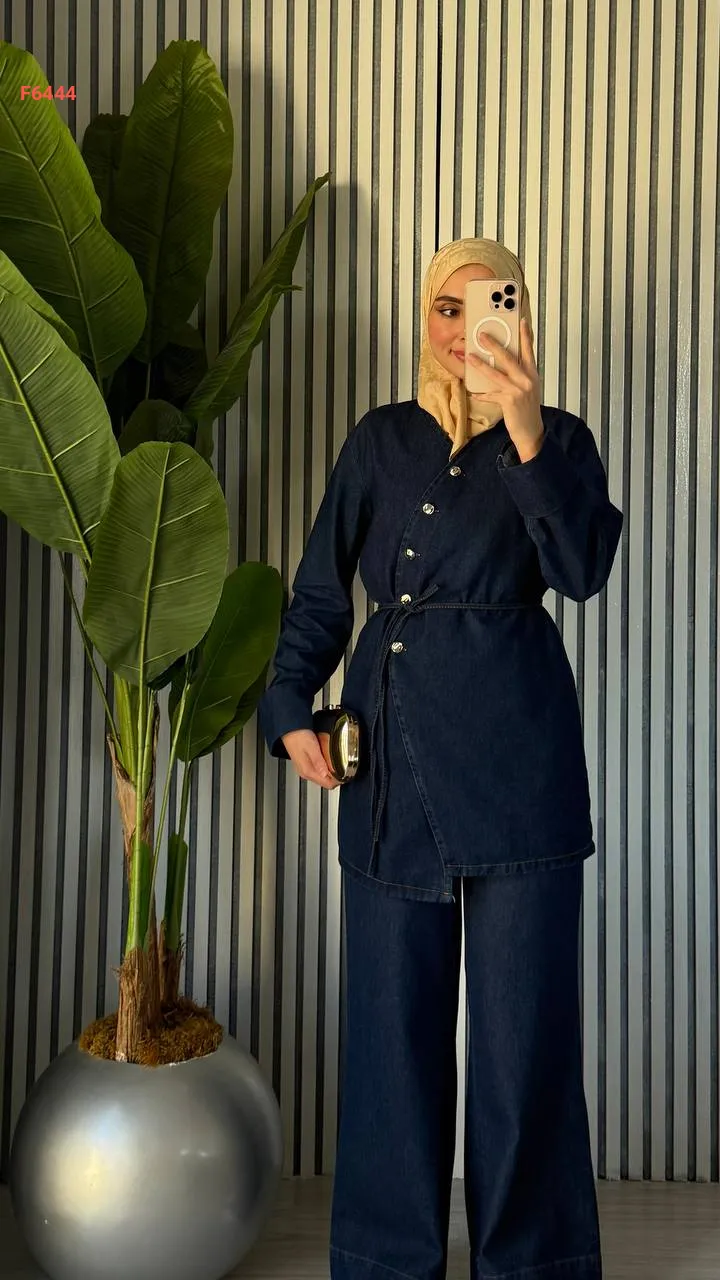 طقم بنطال جينز وجاكيت بأزرار جانبية