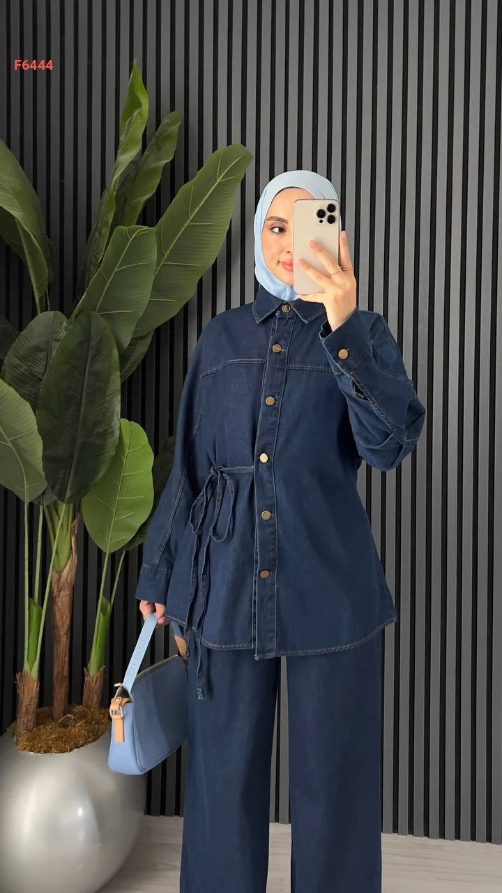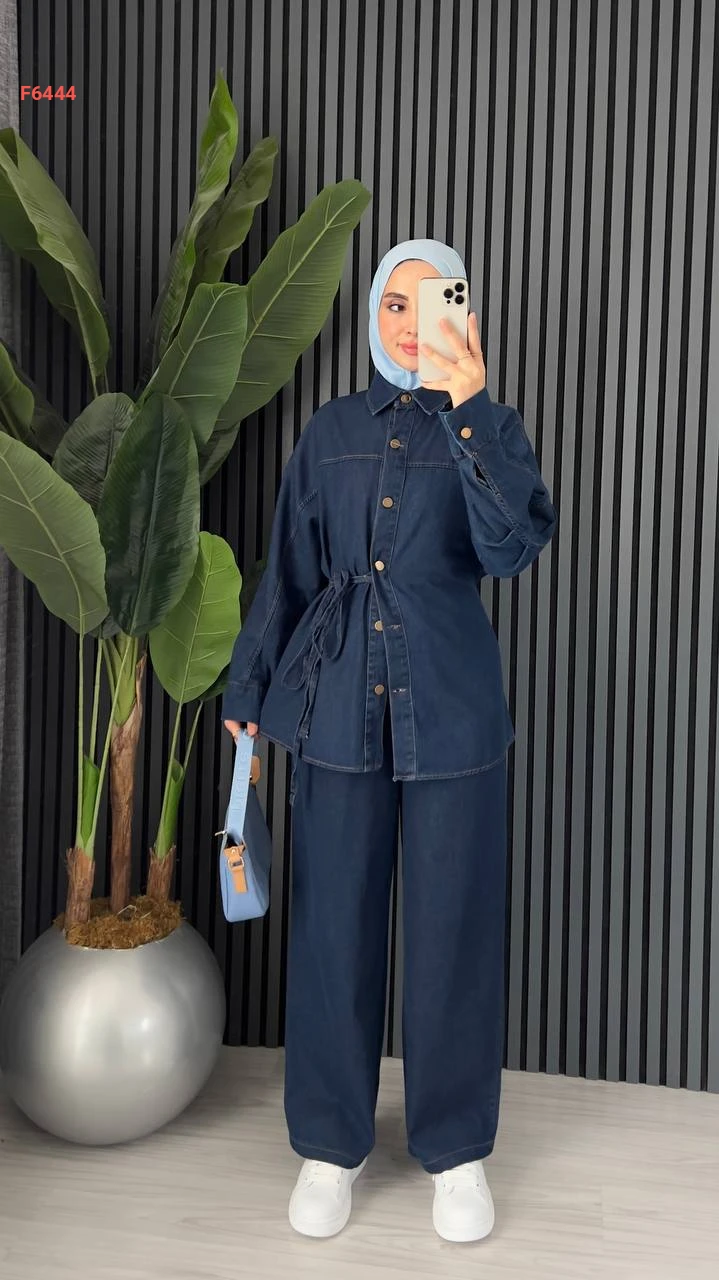 طقم بنطال جينز وجاكيت بربطة جانبية
