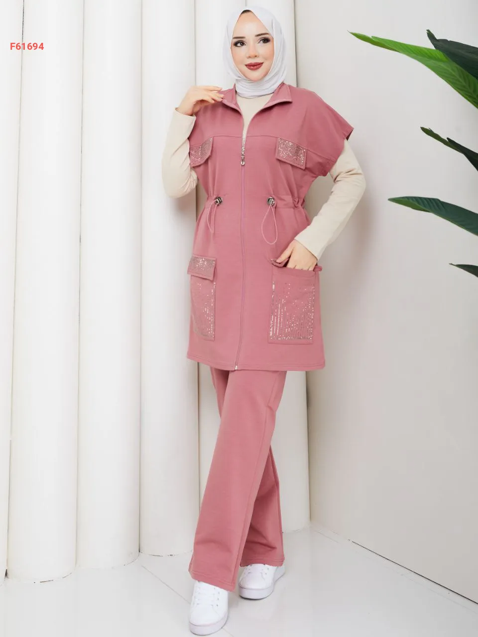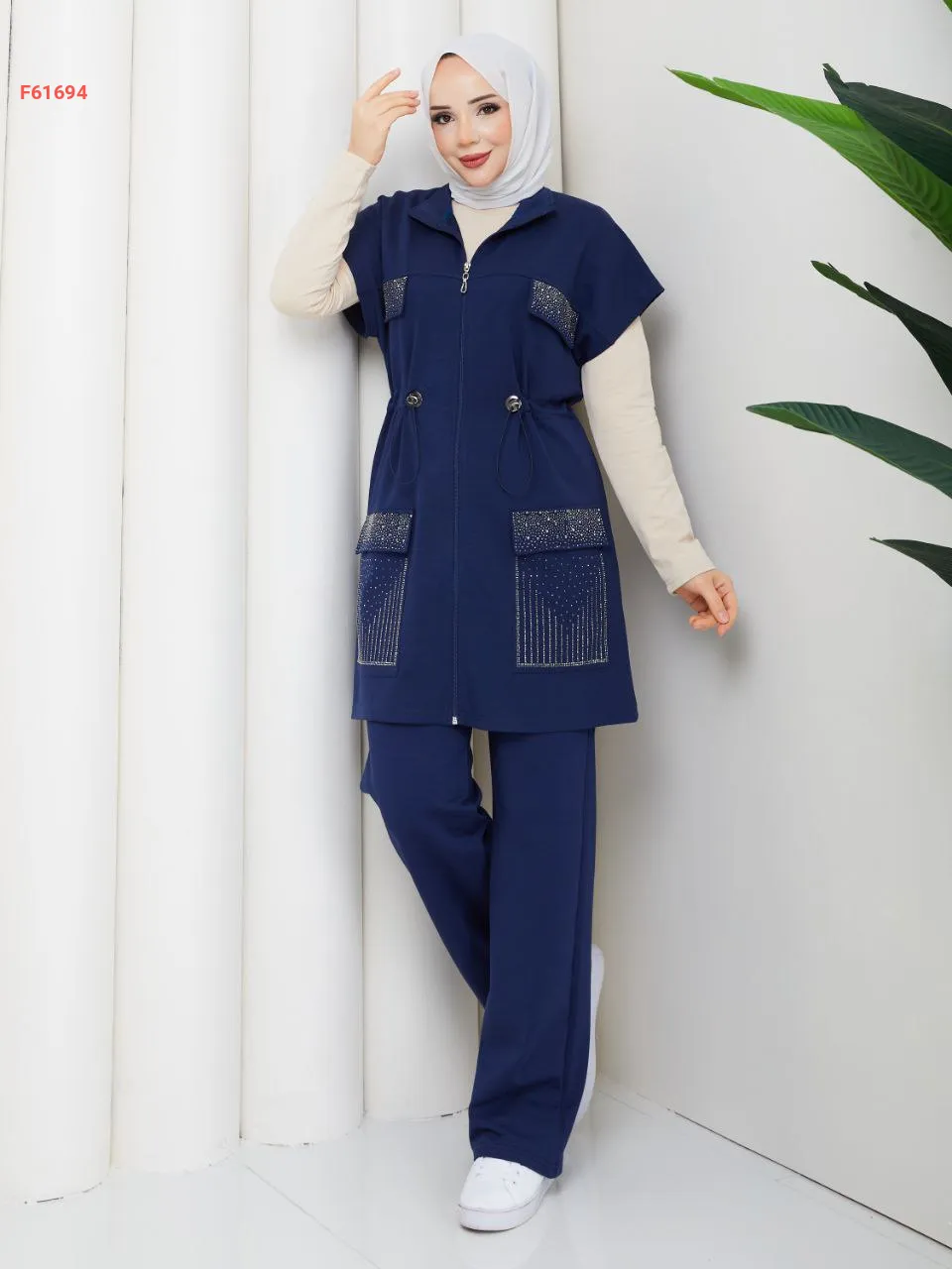 طقم جينز بسحاب مع زمة خصر، بجيب عريضة مرصعة بلاستراس