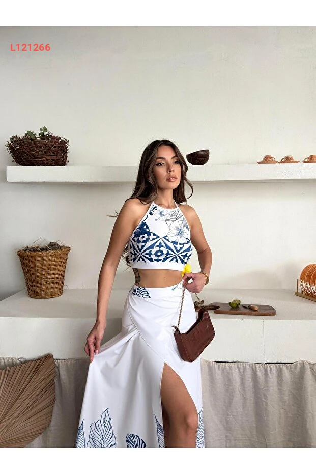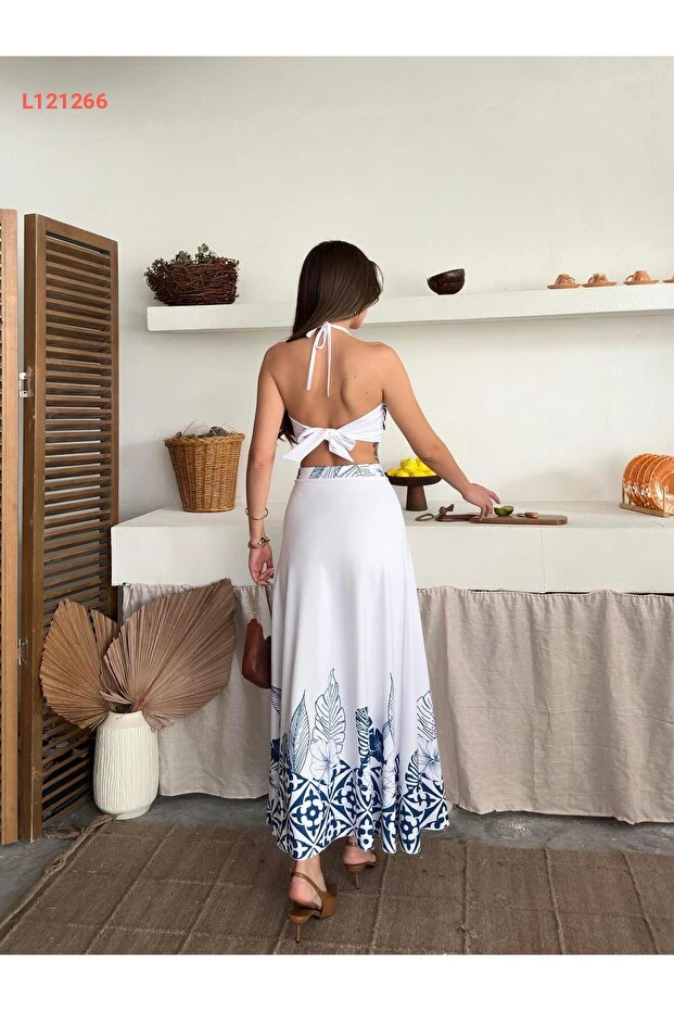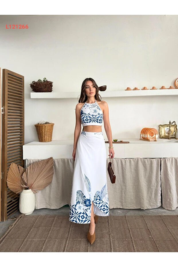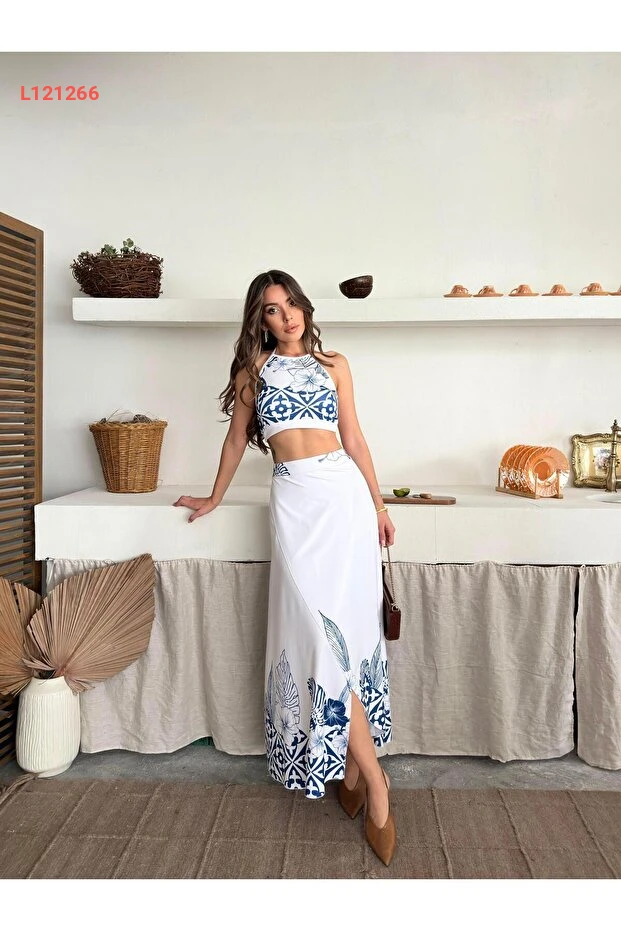 طقم تنورة ماكسي مزينة بنقوش إثنية باللون الأزرق مع قصّة قصيرة