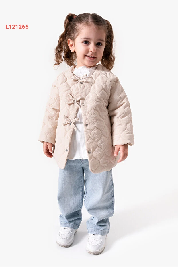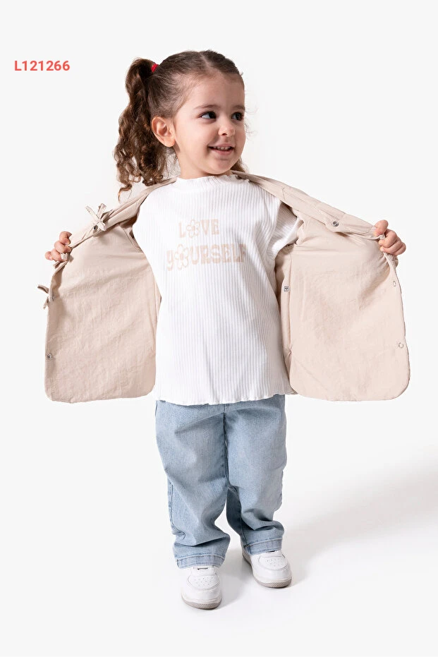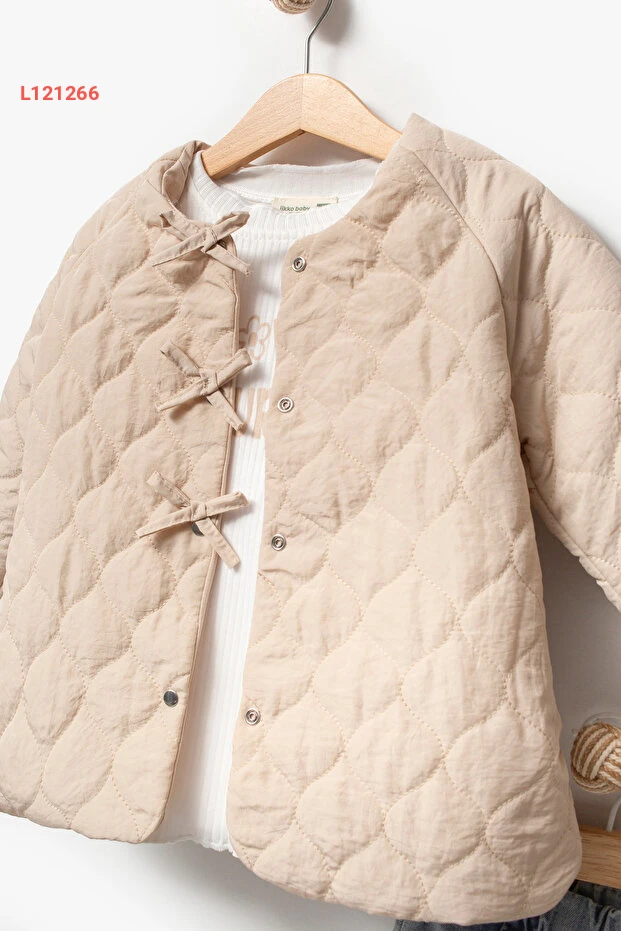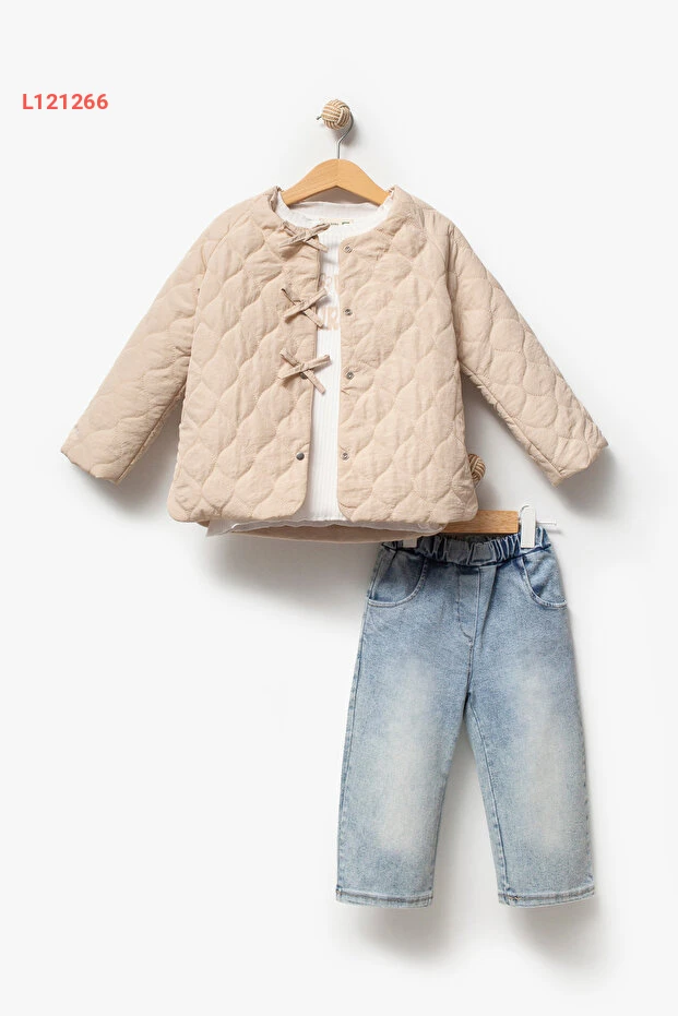 طقم بنات ثلاثي تفاصيل الفيونكة الجيكلو مع جاكيت مبطن 9088