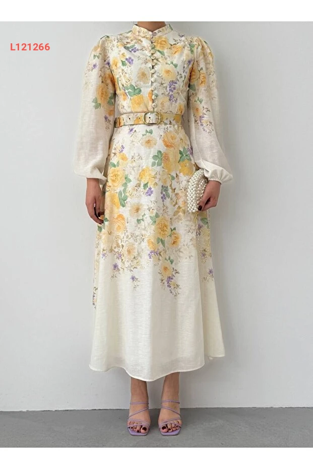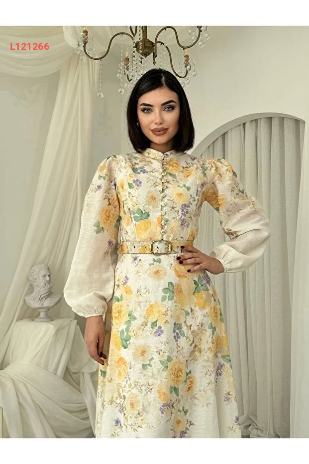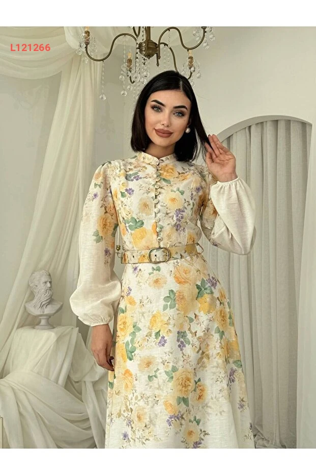فستان كتان مميز بتصميم الأزرار وزهور صفراء مع حزام ونقشة رائعة