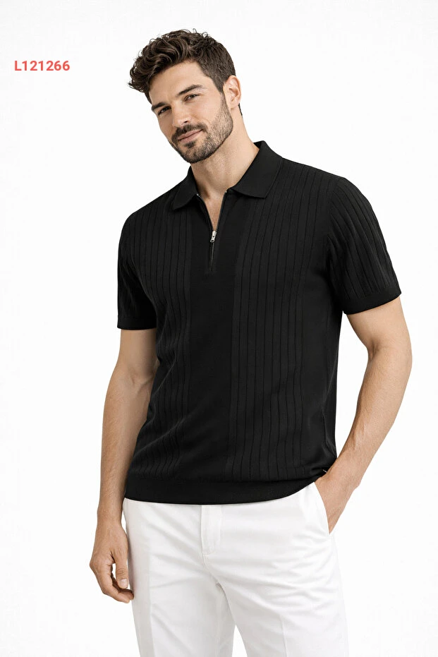 تيشورت بولو رجالي أسود بقصة مريحة بسحاب من كارييل بوتيك