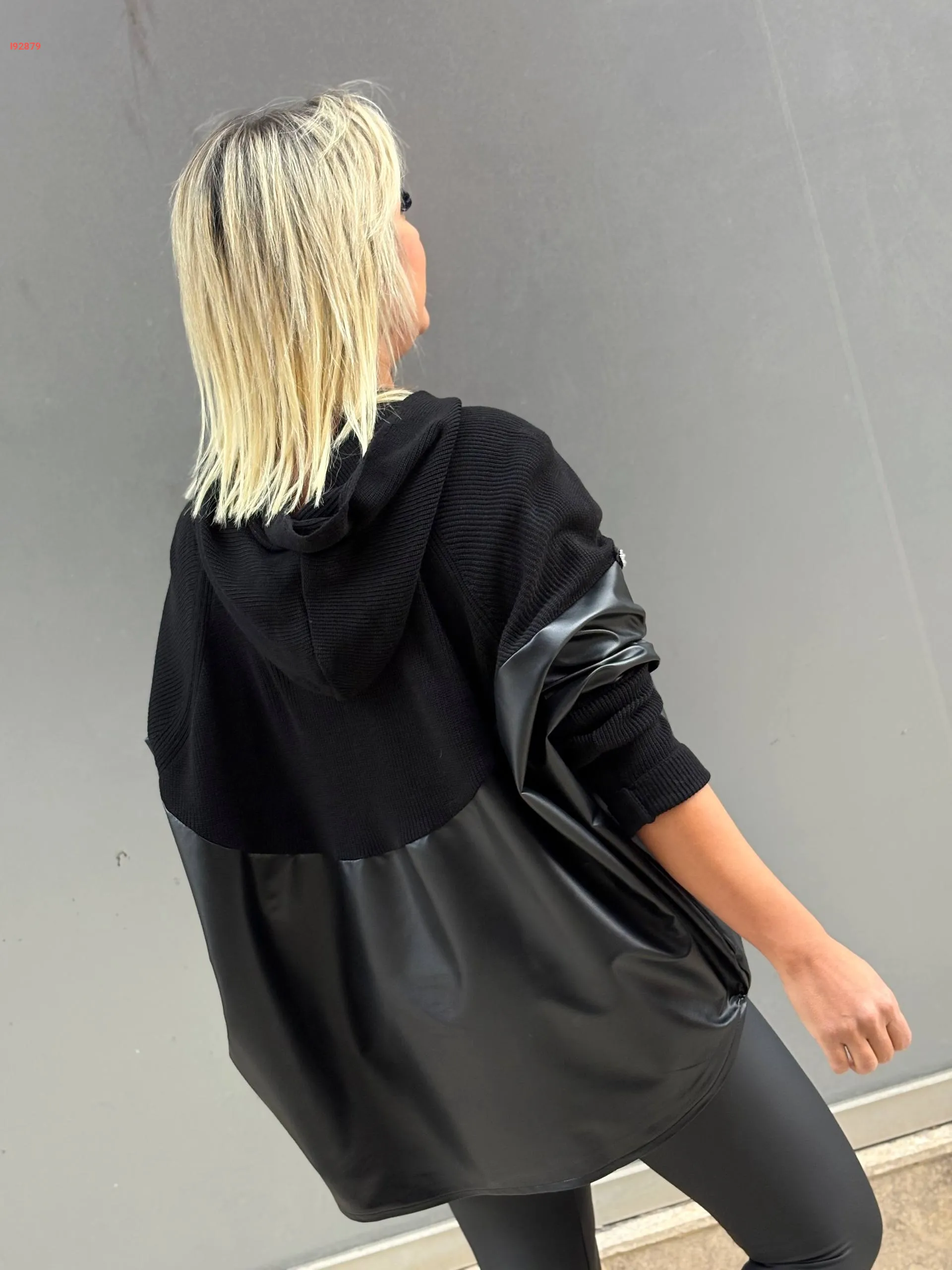 بلوزة تريكو وجلد مزينة أحجار مع طاقية