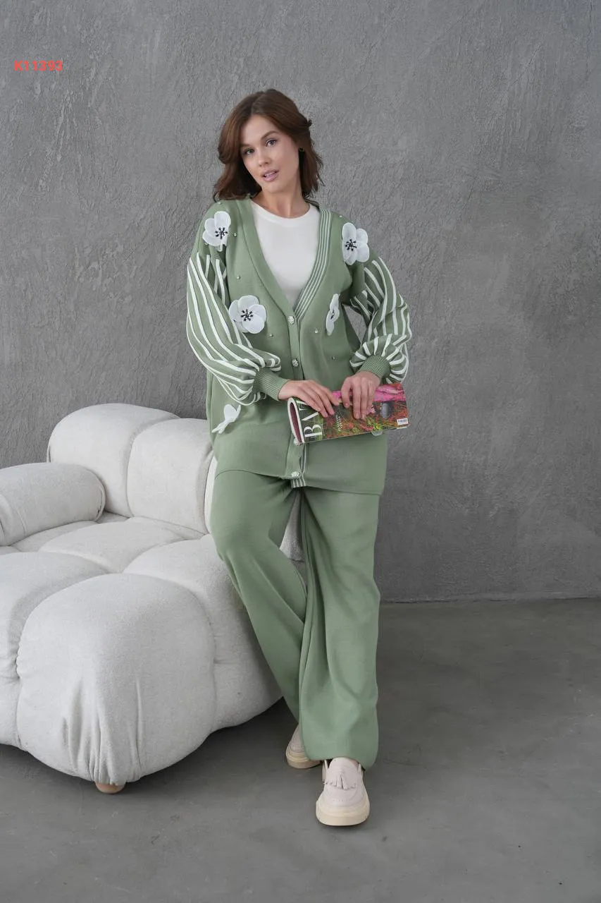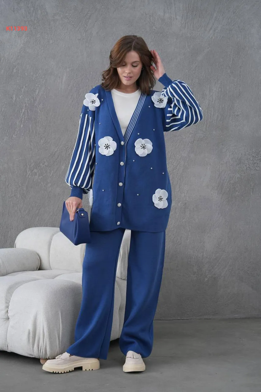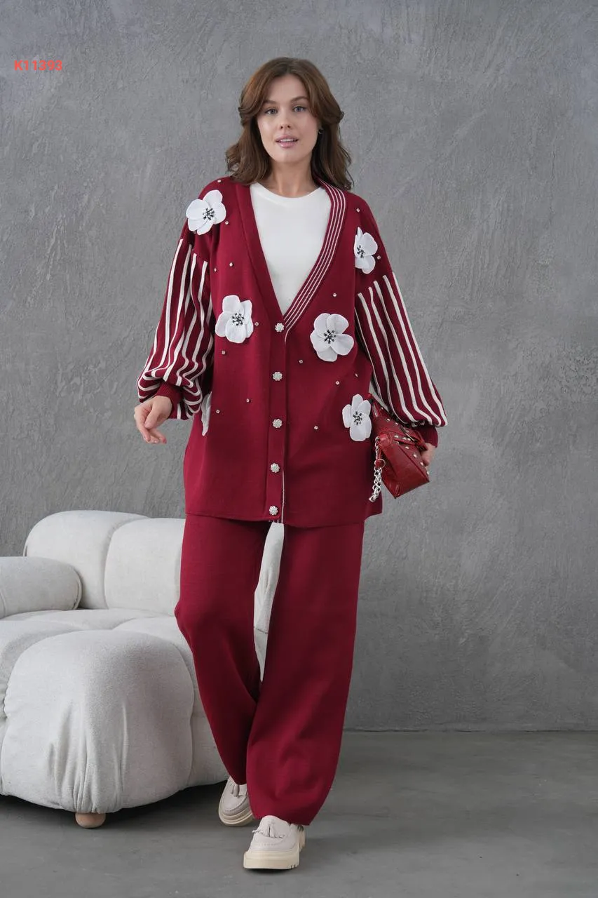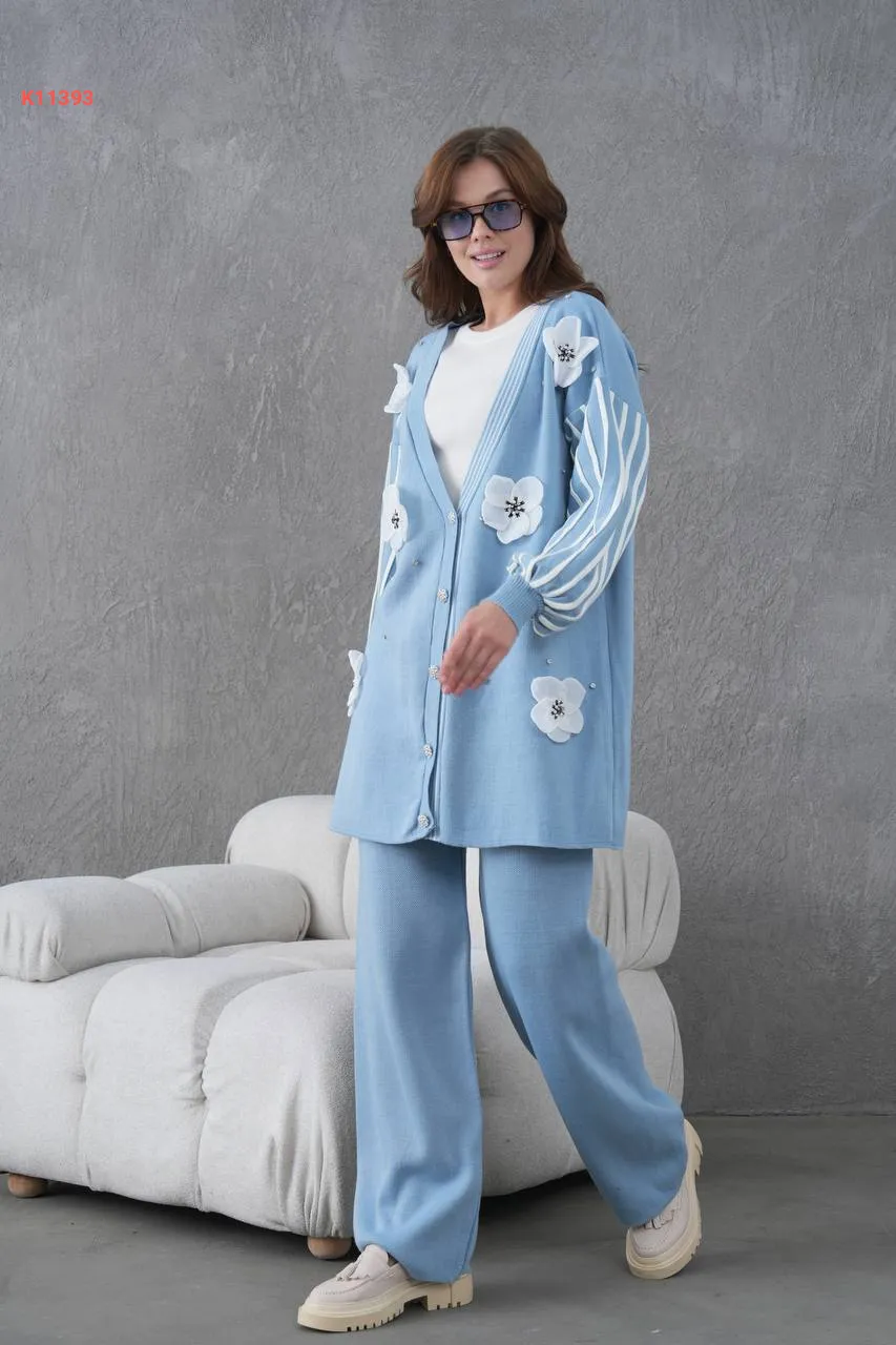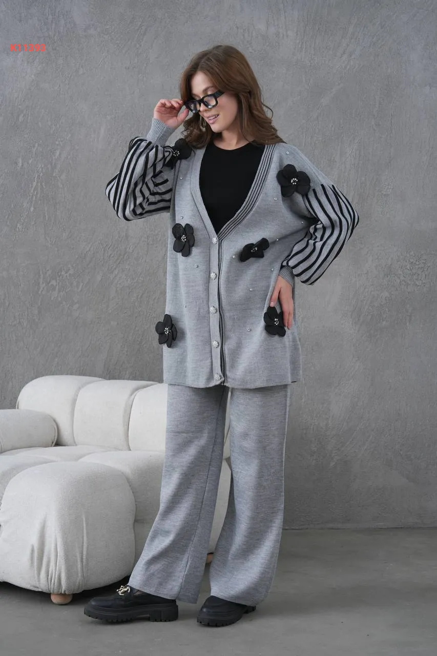 طقم بنطال تريكو وجاكيت مزين ورد