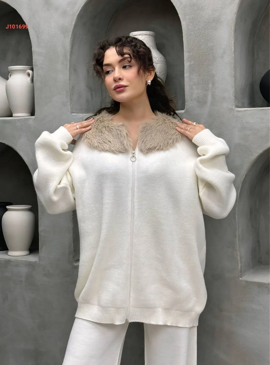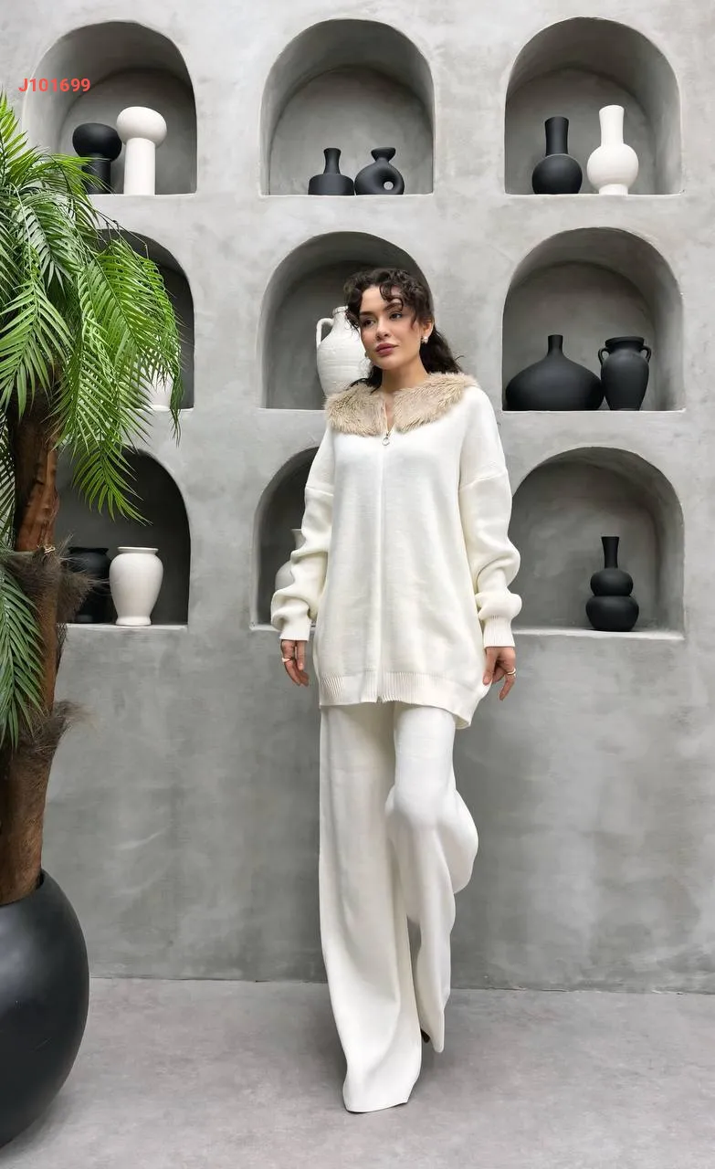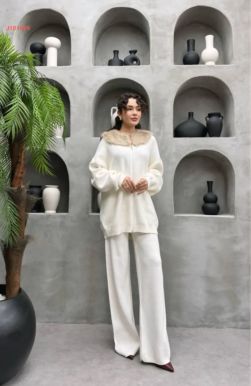 طقم بنطال تريكو وجاكيت بياقة فرو