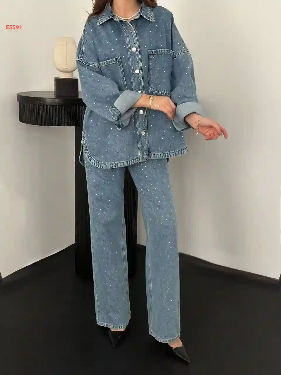 طقم بنطال جينز وجاكيت مرصع أ...