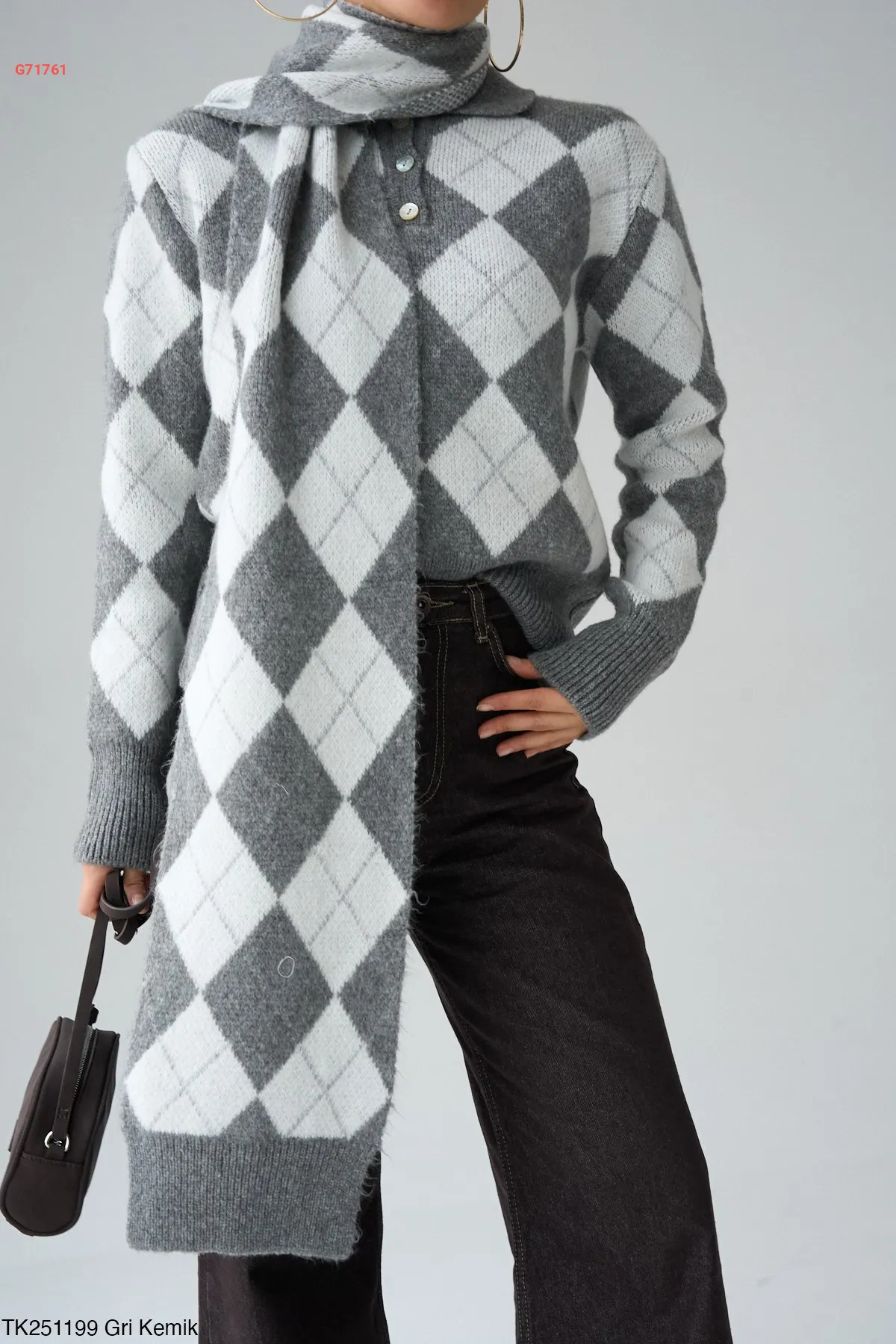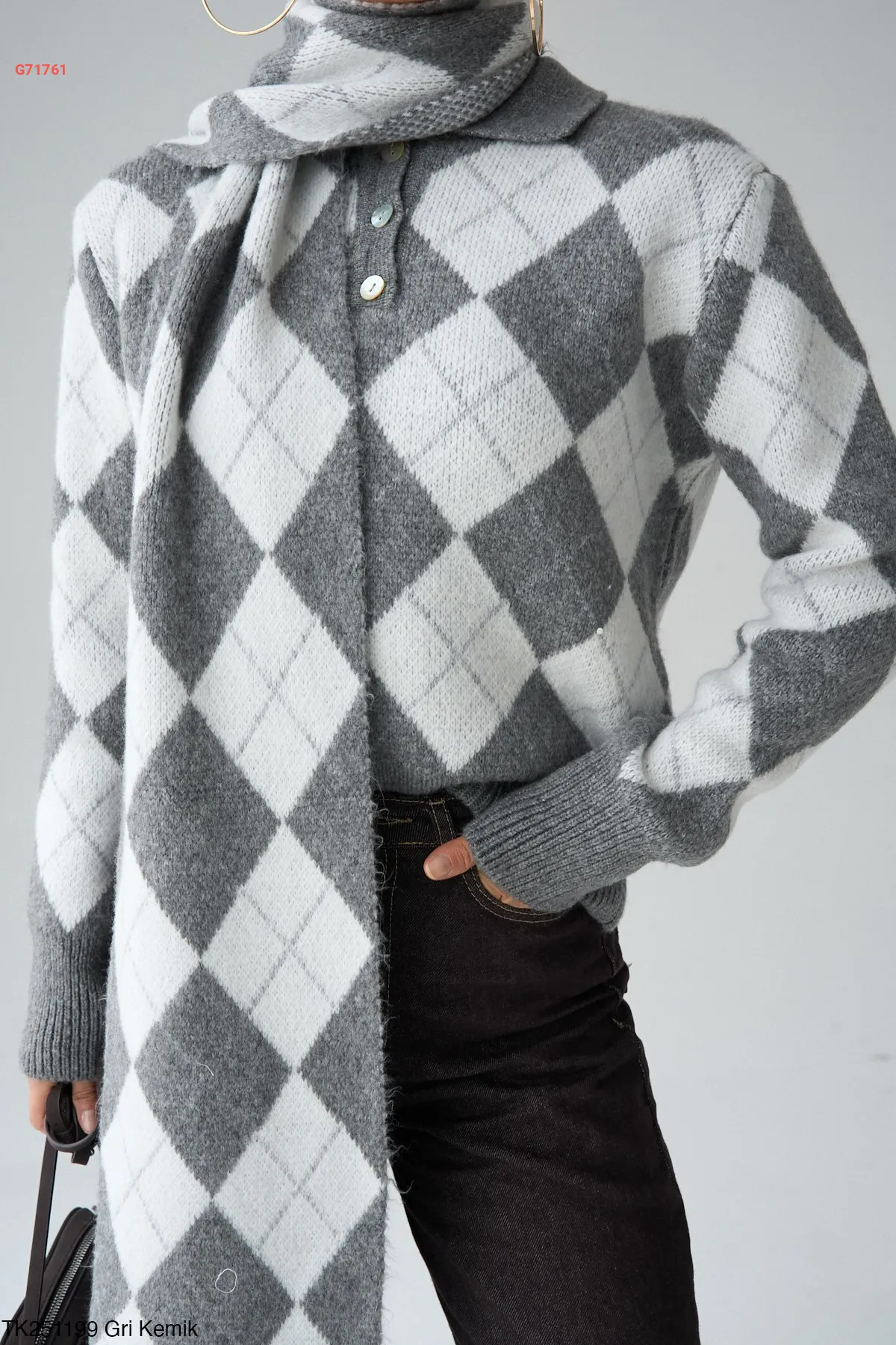 كنزة تريكو منقوشة مع سكارف طويل