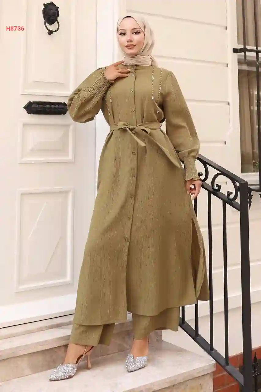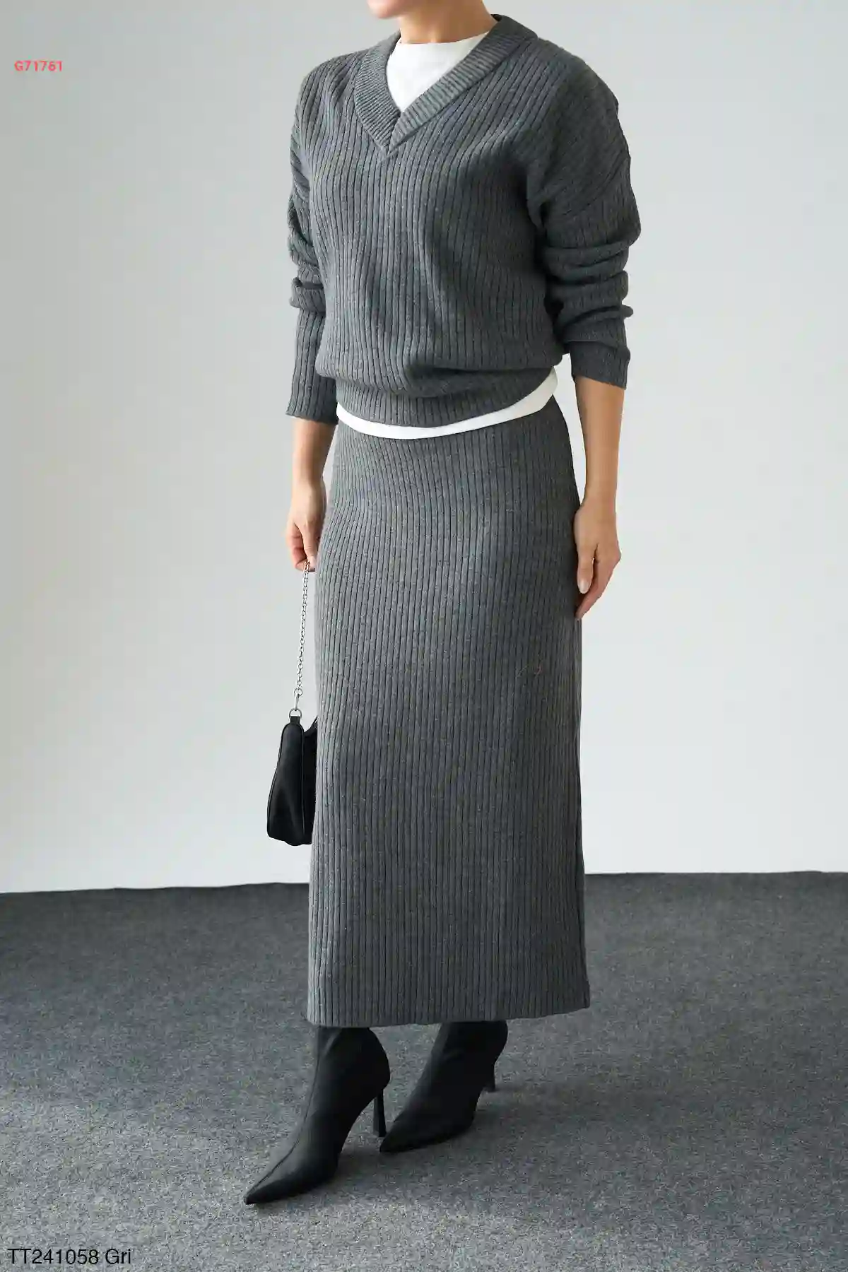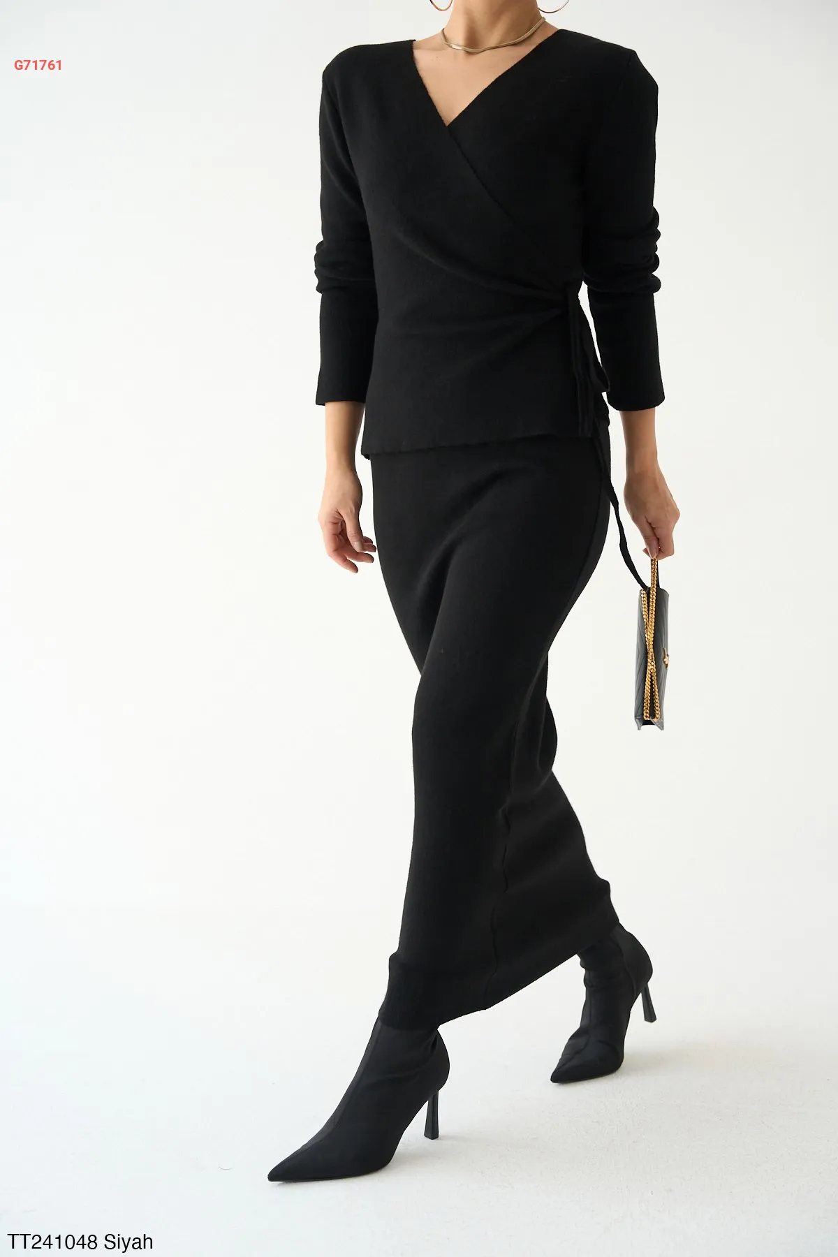 طقم تنورة تريكو وجاكيت بربطة جانبية