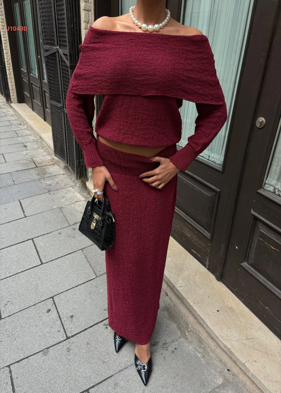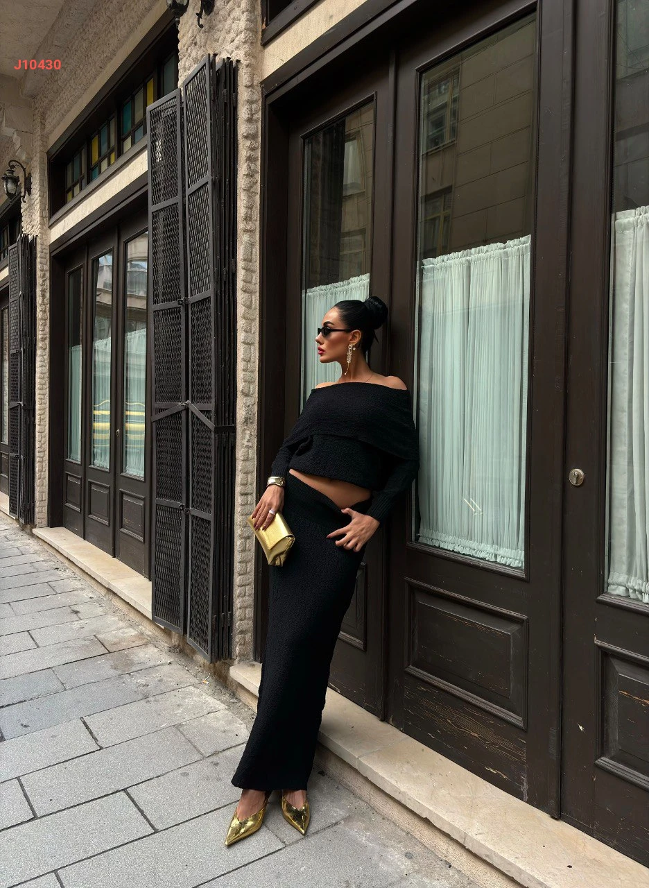 طقم تنورة تريكو وبلوزة بياقة مادونا