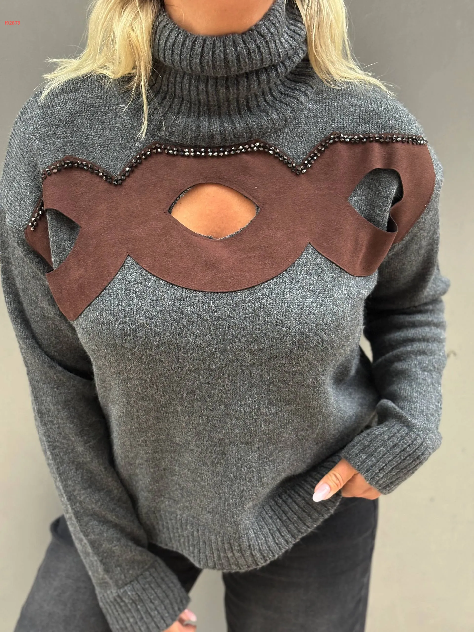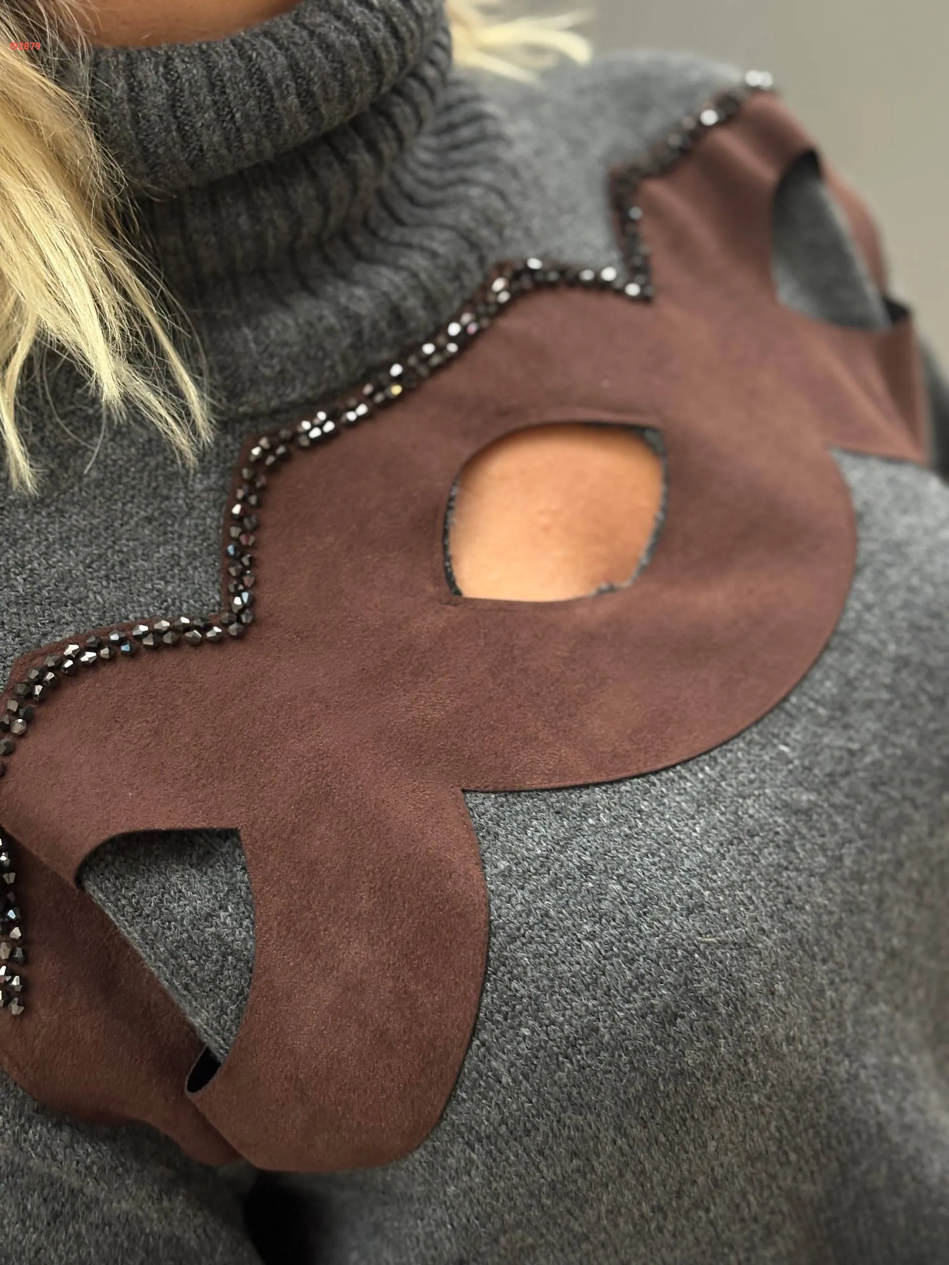 كنزة تريكو وشامواه مقطعة مع ستراس
