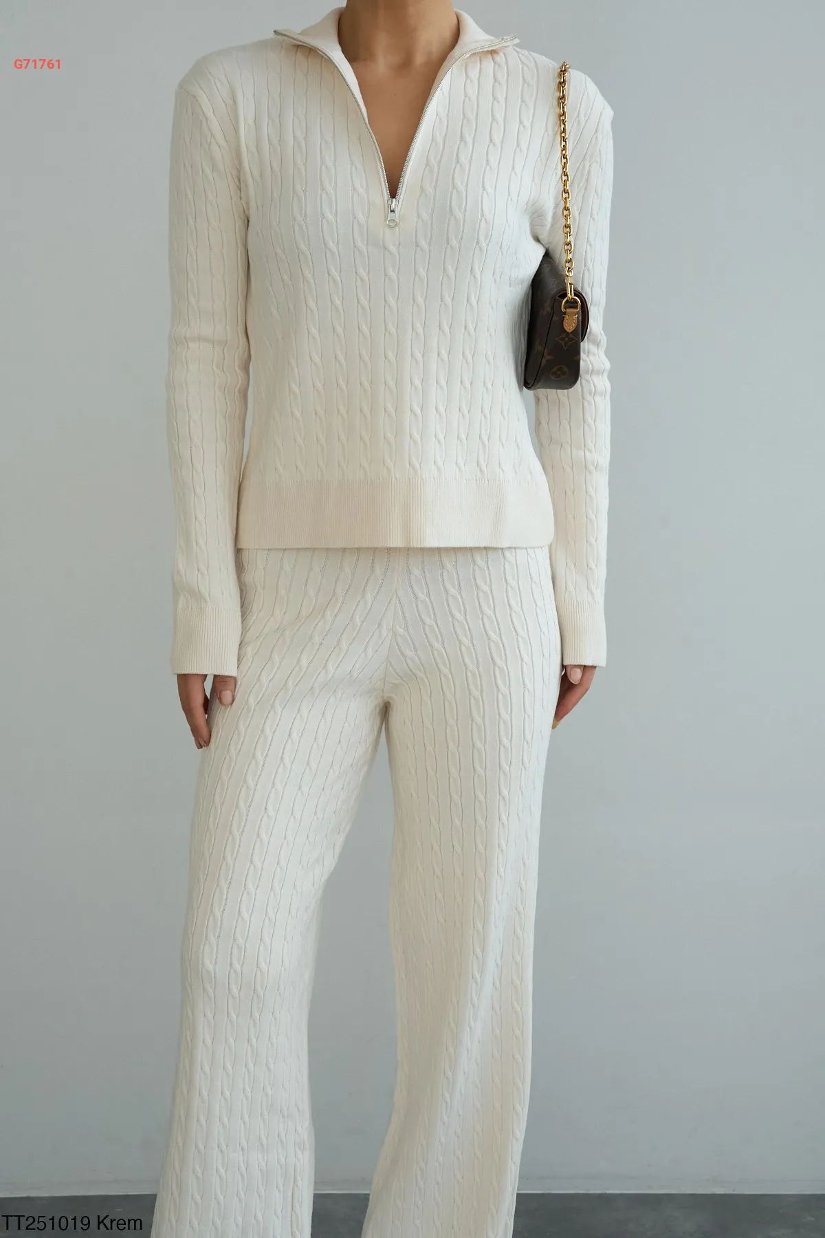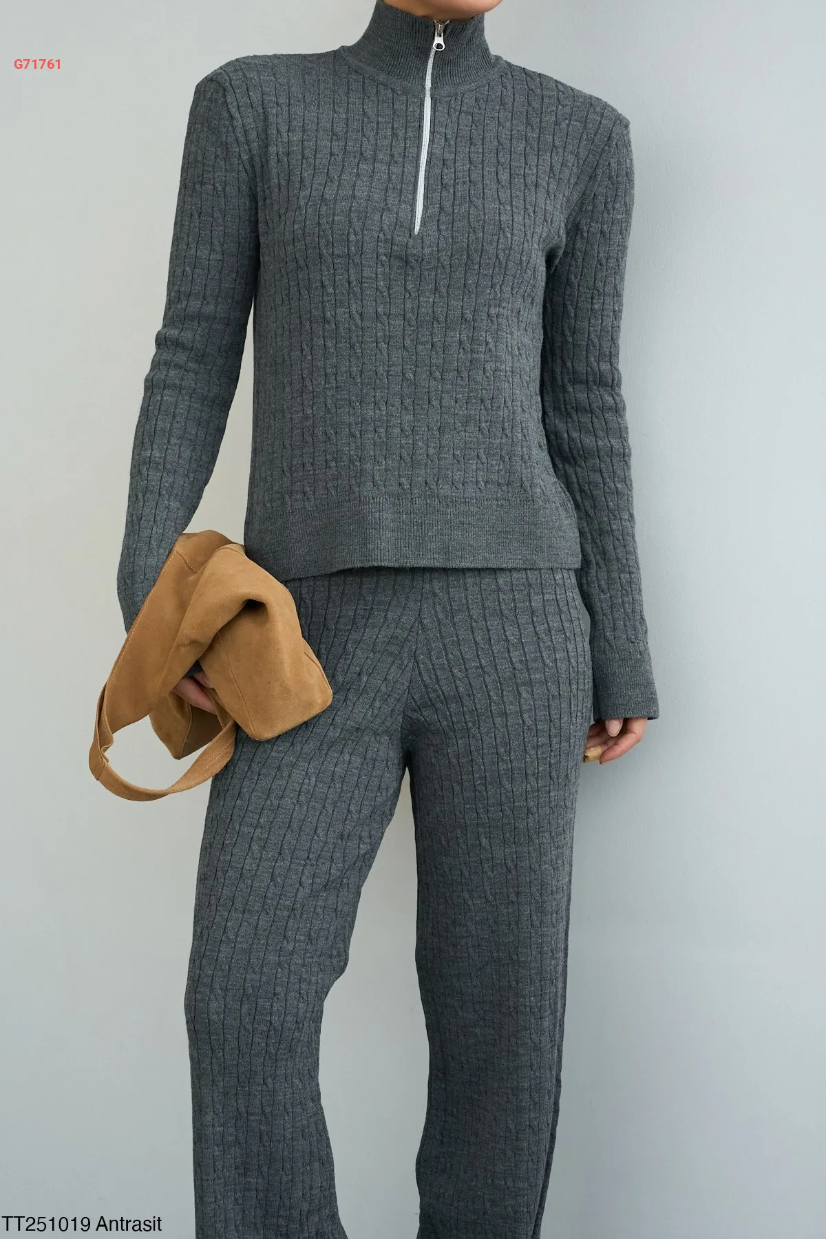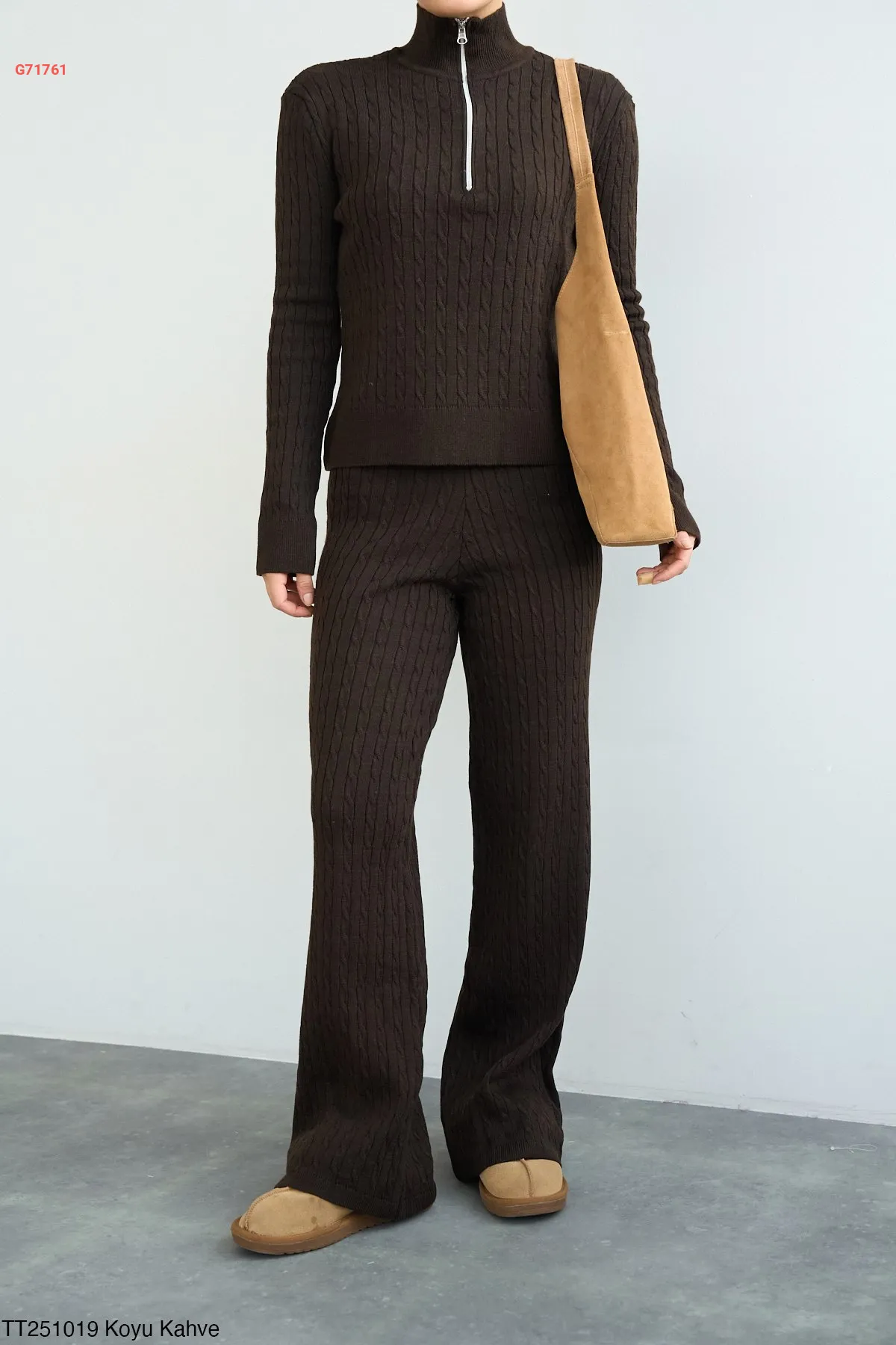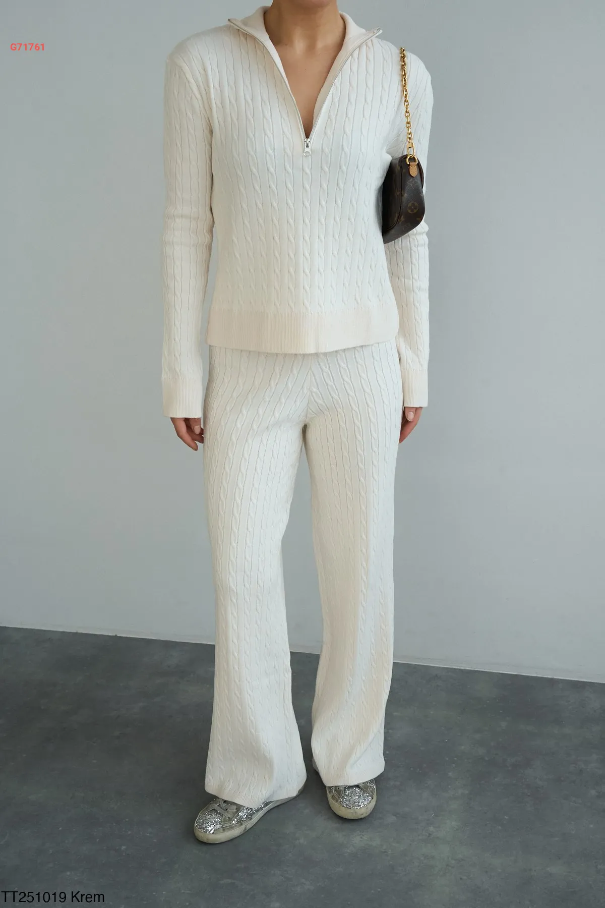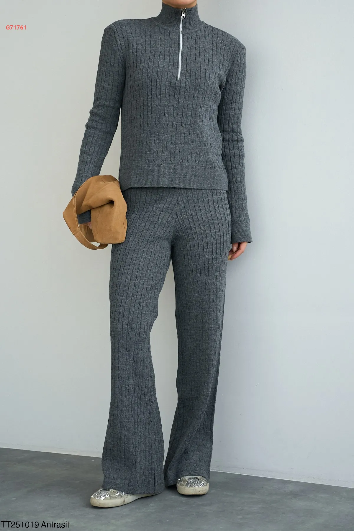 طقم بنطال تريكو مجدول وكنزة بسحاب