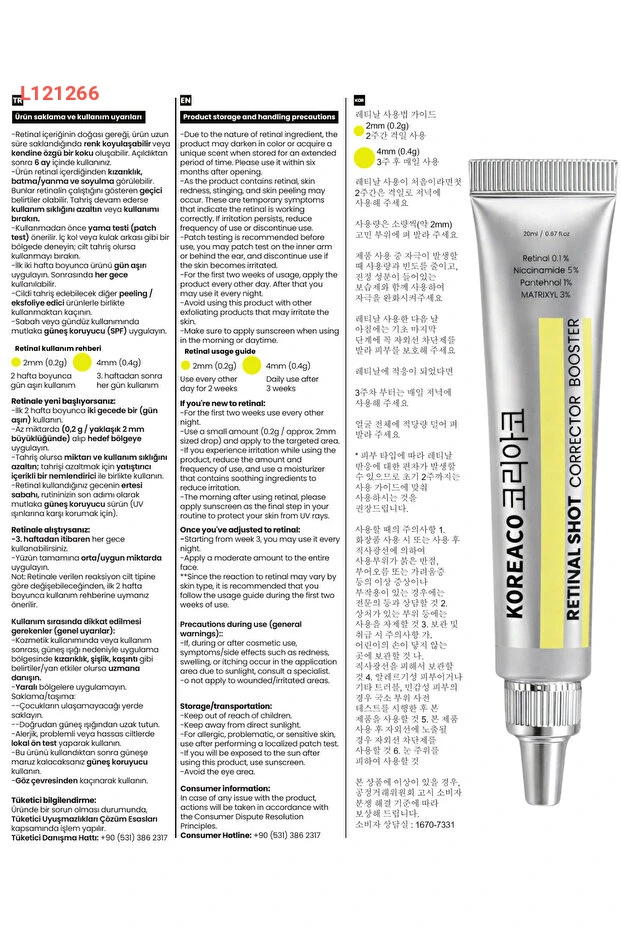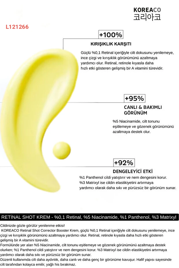 احصل على بشرة أكثر إشراقًا ومرونة مع كريم KOREACO Retinal 0.1% Shot Corrector Booster. يحتوي على 5% نياسيناميد و1% بانثينول و3% ماتريكسيل، مما يساعد على تصحيح الخطوط الدقيقة والتصبغات وتحسين مستوى الترطيب. صيغة مكثفة توفر لك نتائج ملحوظة، لتبدو بشرتك شابة وصحية.