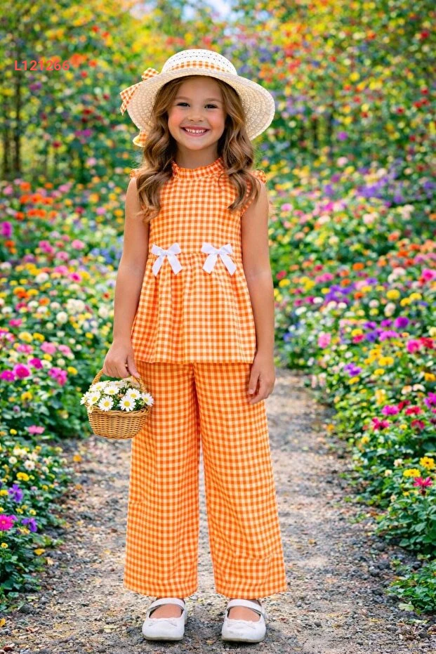 طقم صيفي ثلاثي القطع للفتيات بألوان مربعة مع قبعة من كوزادان كيدز