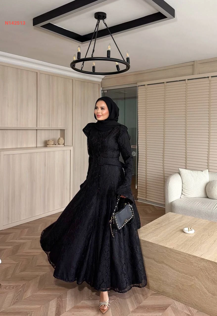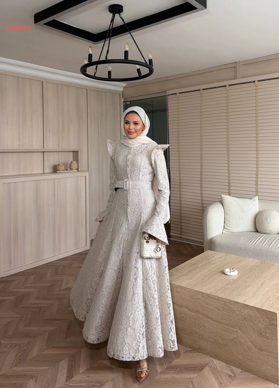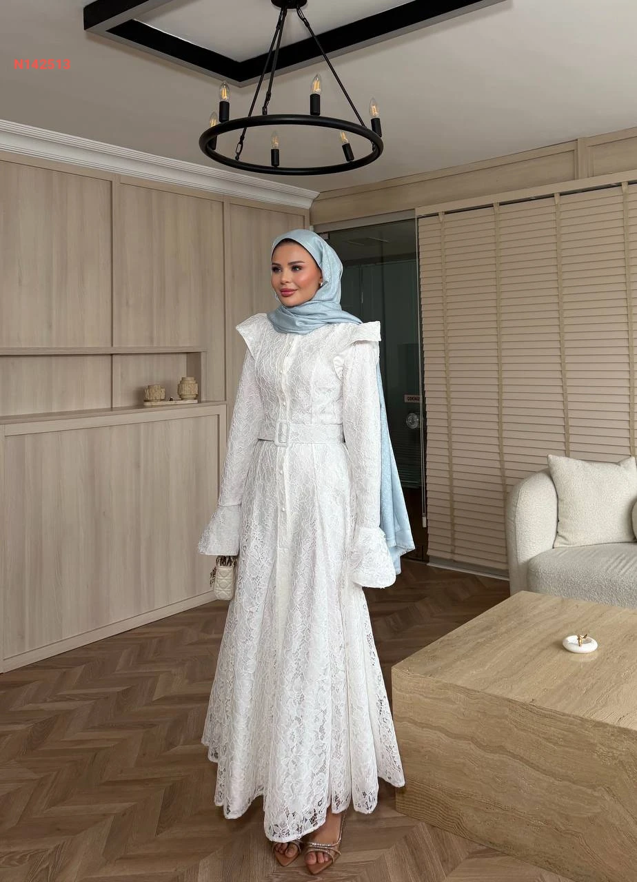 فستان دانتيل كلوش مبطن بأزرار وحزام