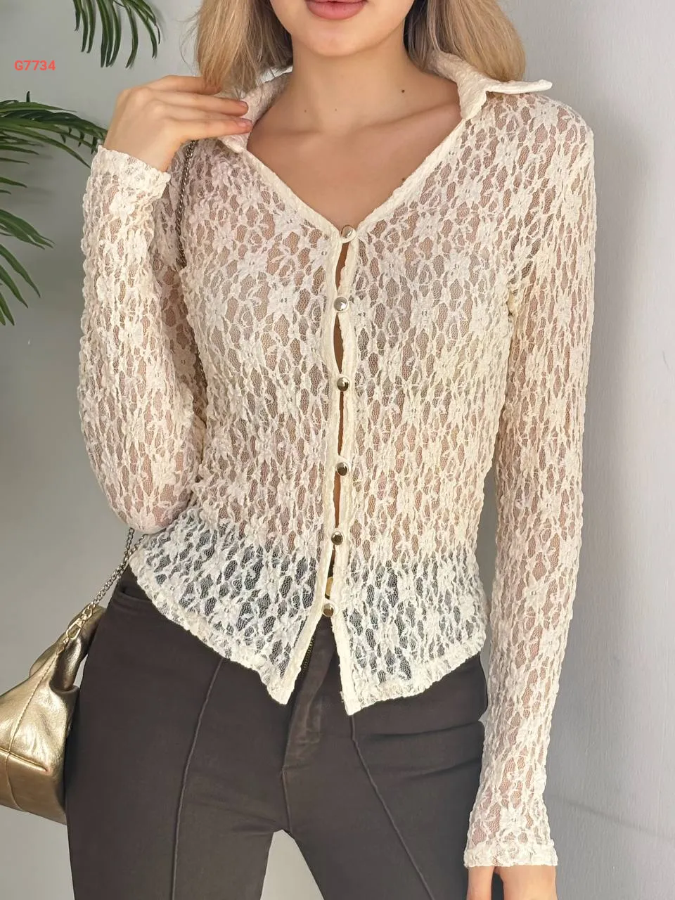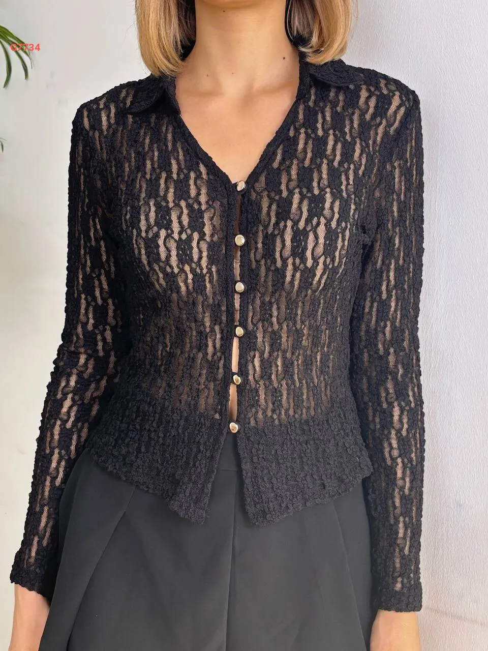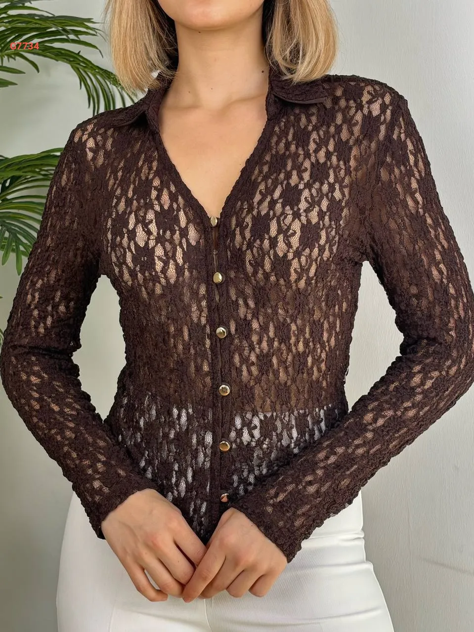 بلوزة دانتيل مفرغة بأزرار