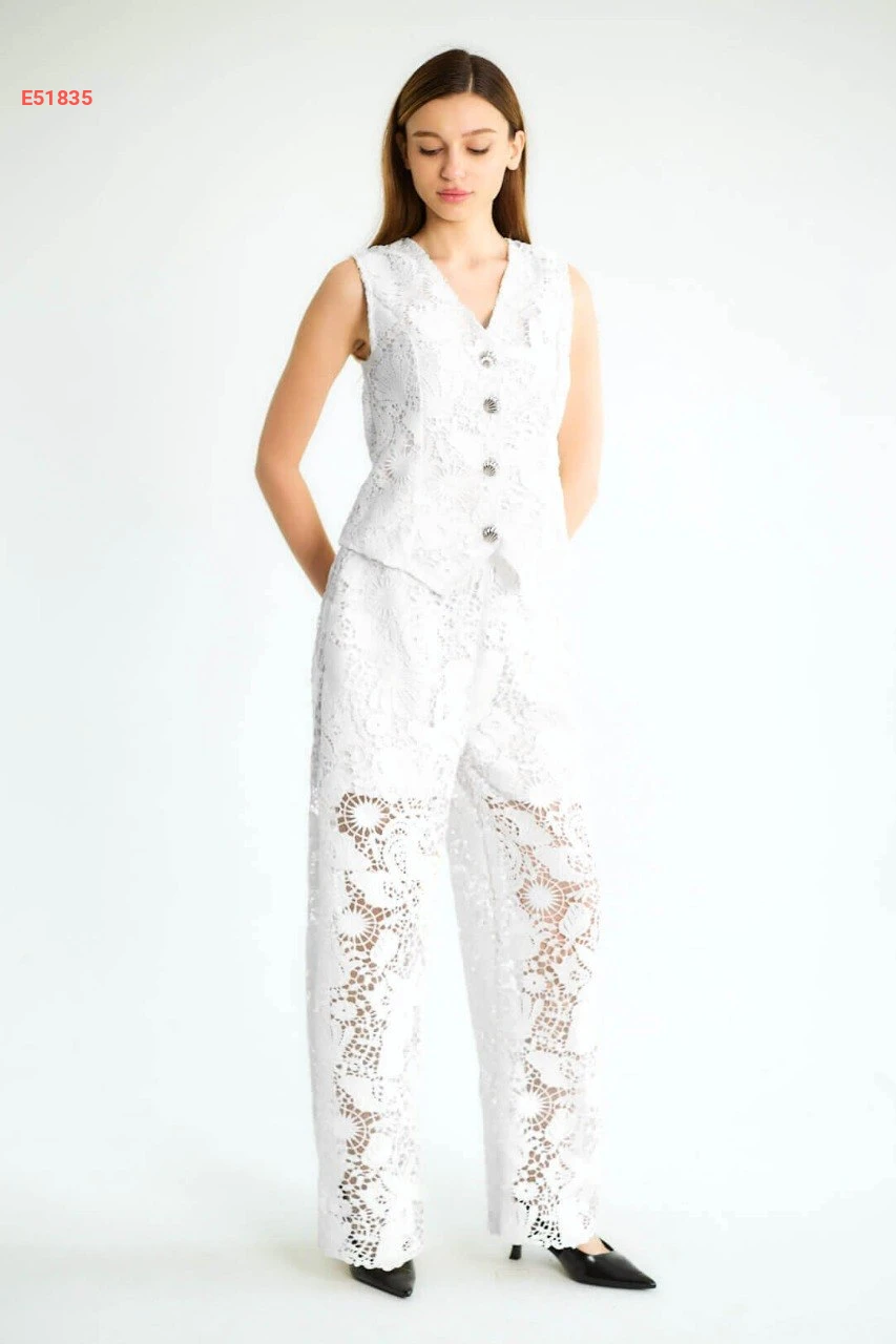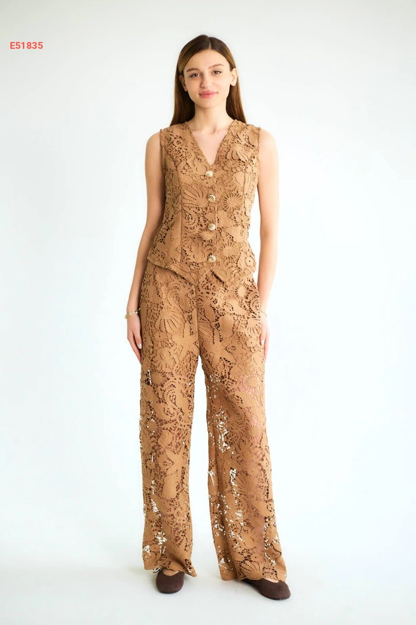 طقم بنطال دانتيل مفرغ مع يلك