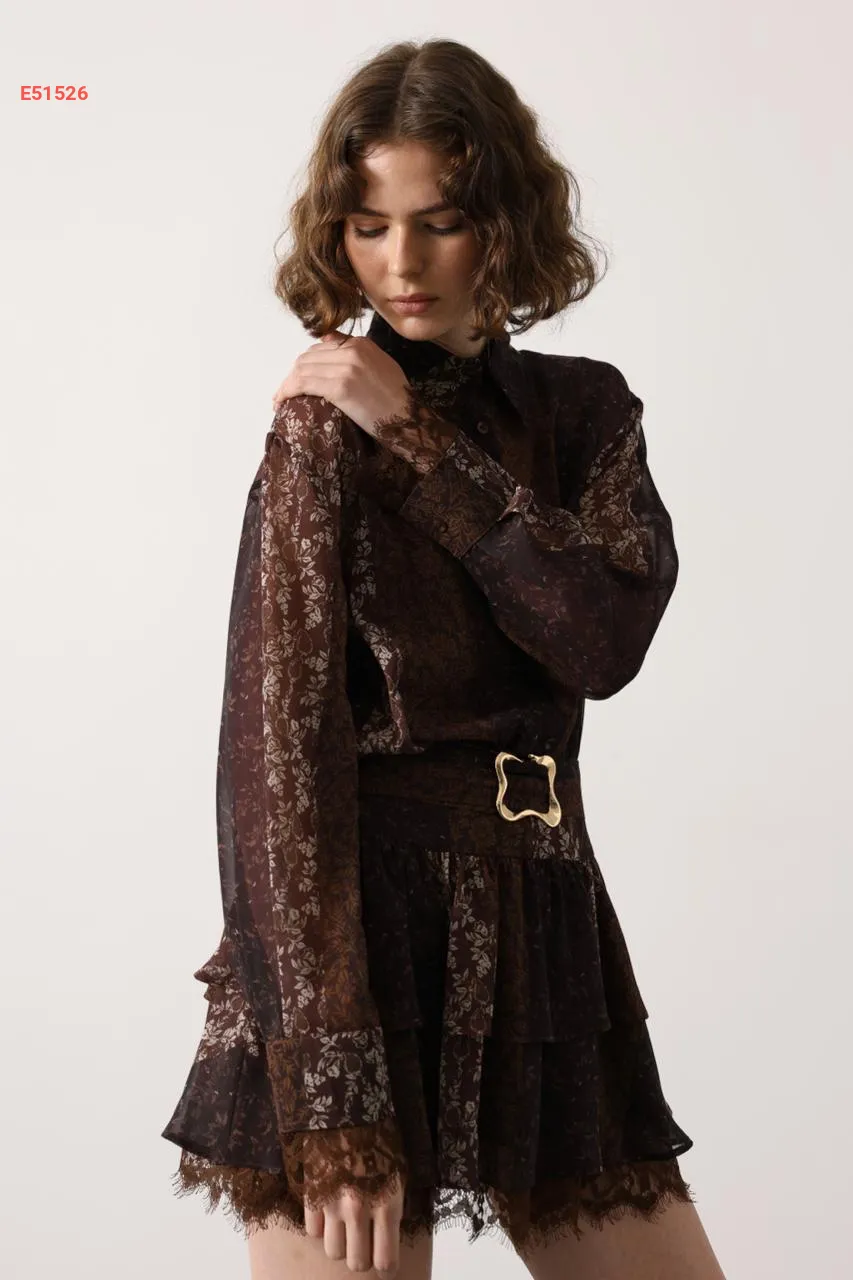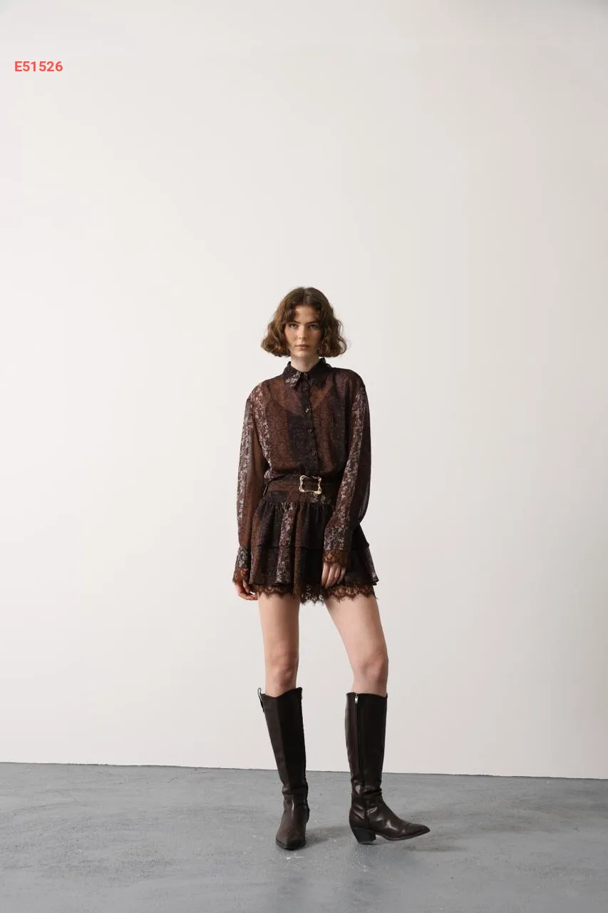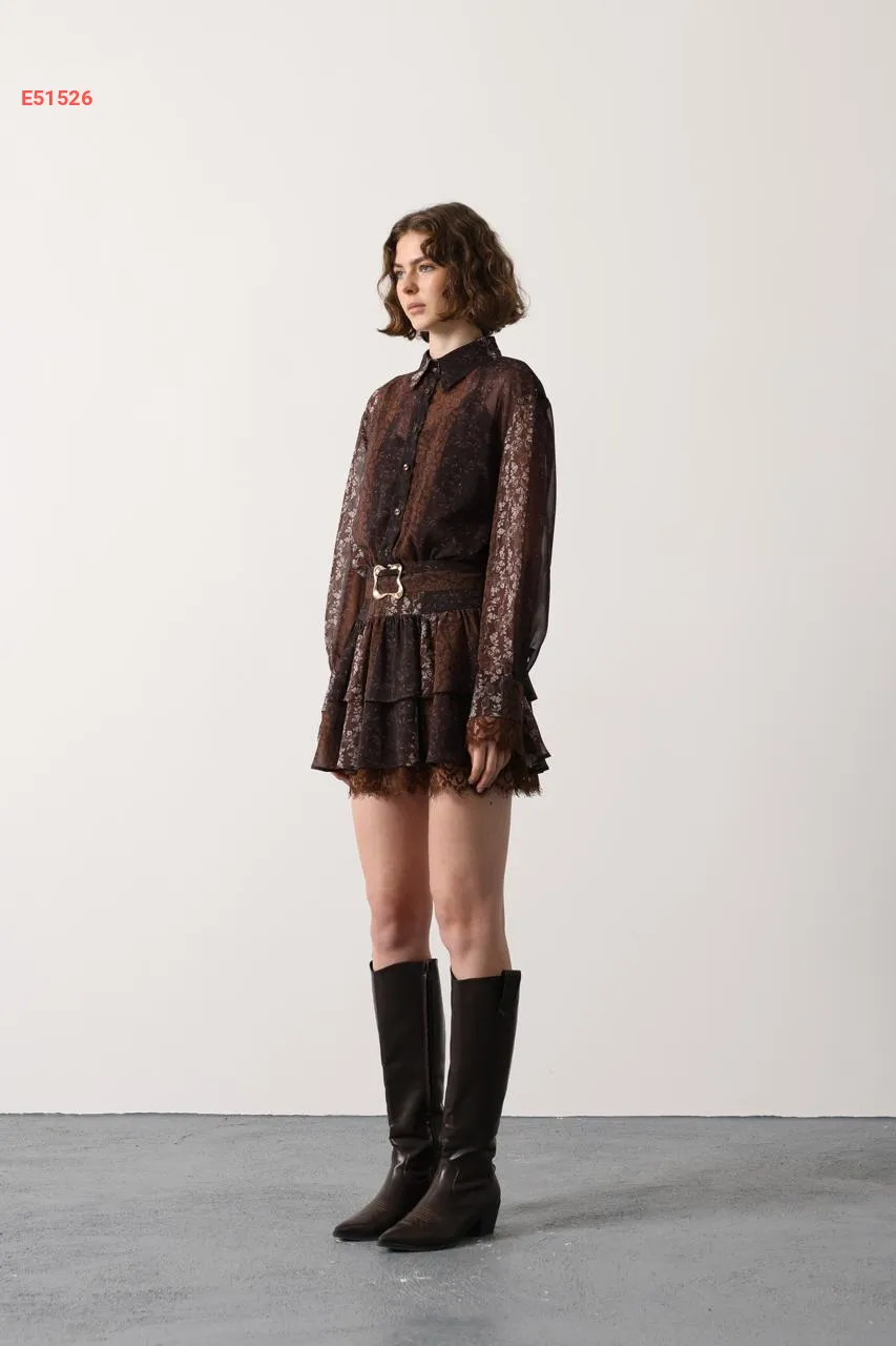 طقم تنورة قصير كشكش بدانتيل
