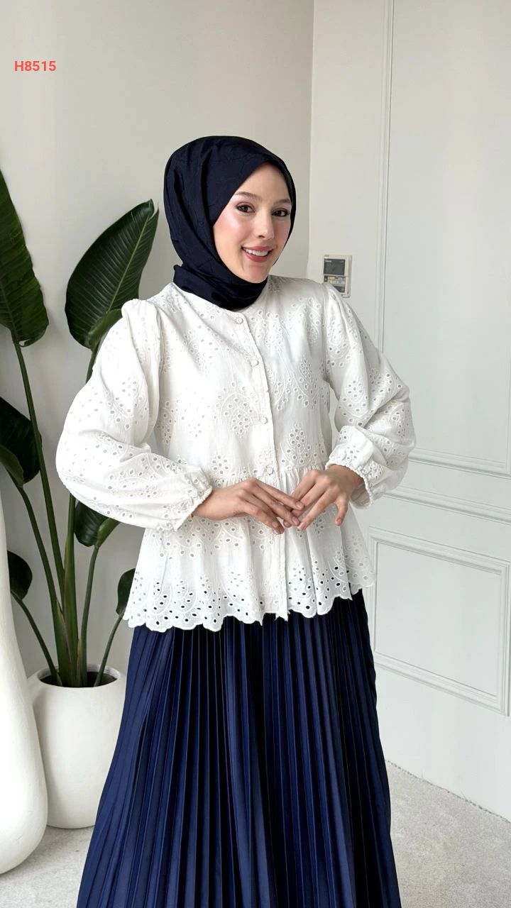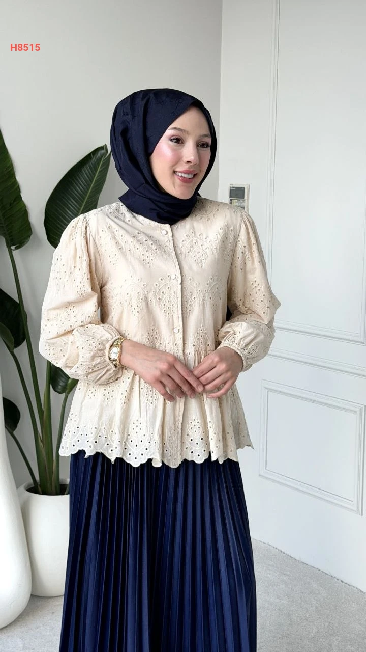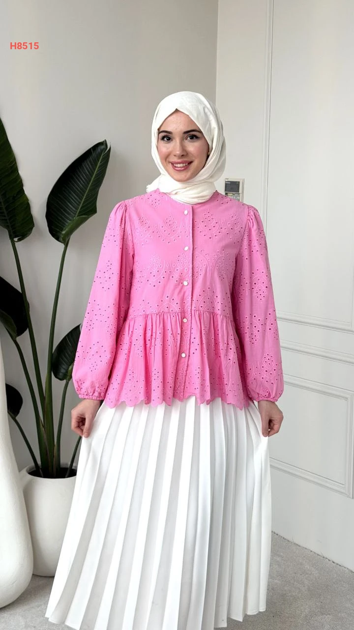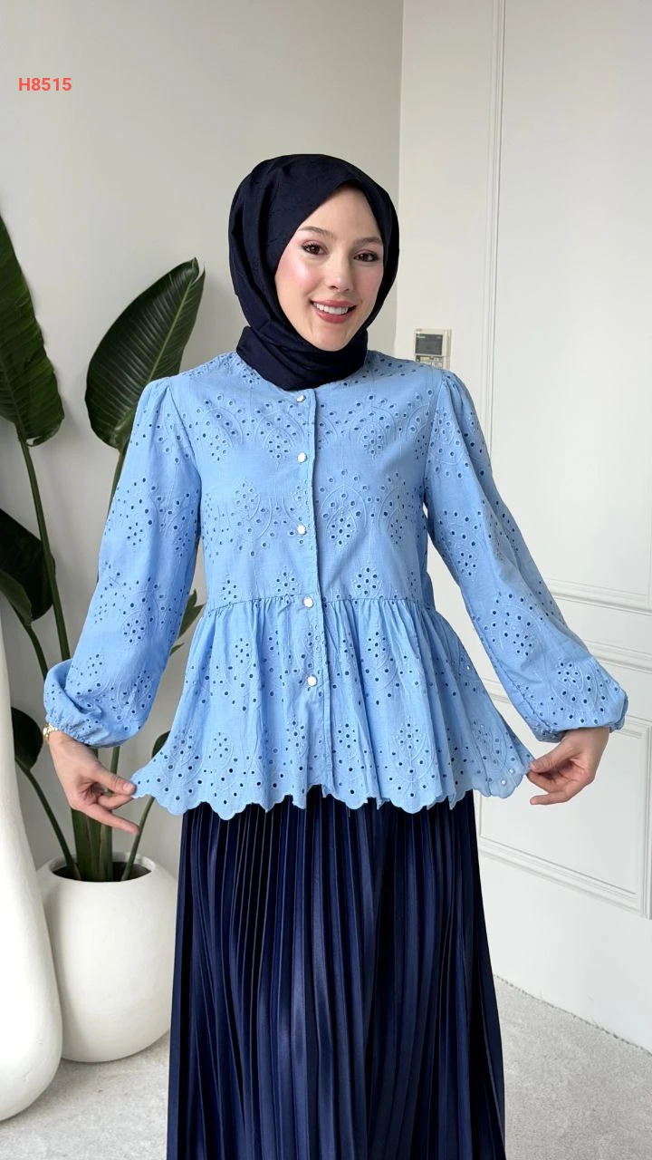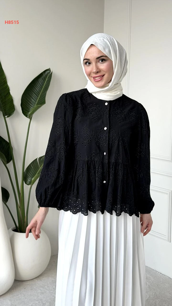 قميص دانتيل مفرغ مع قصة بيبلوم بكشكشة عند الخصر وأطراف مسننة