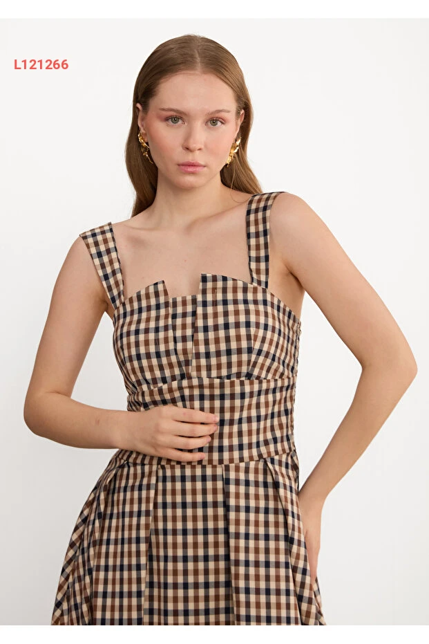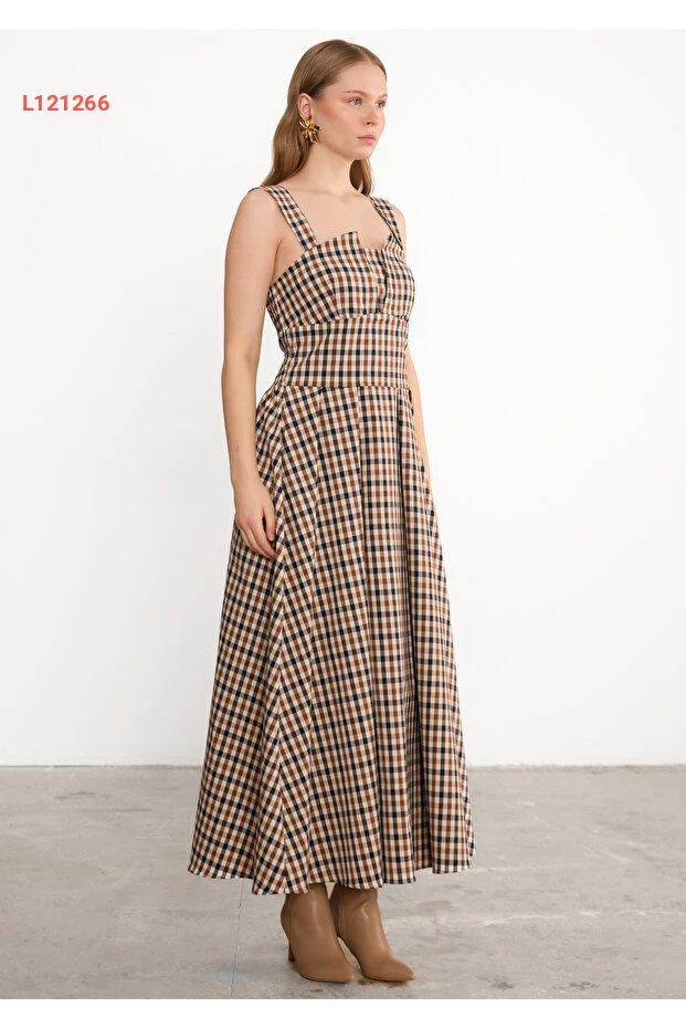 فستان كافيه مربعات مزين بياقة مستديرة من مجموعة لاديا