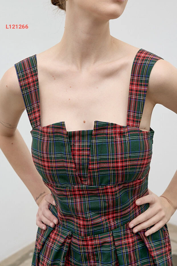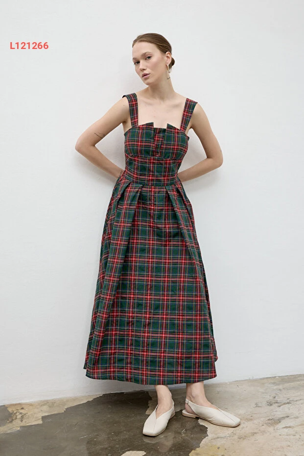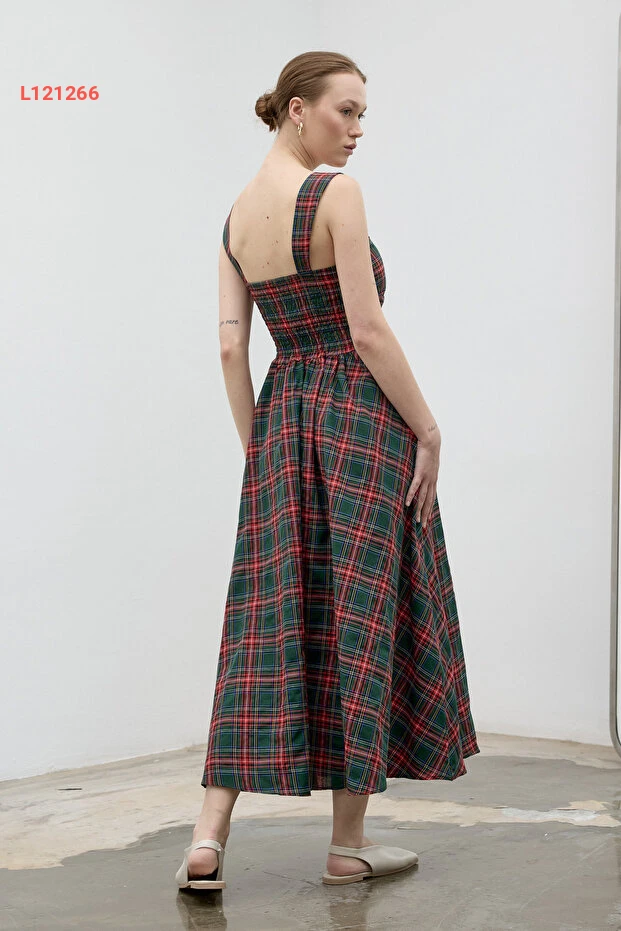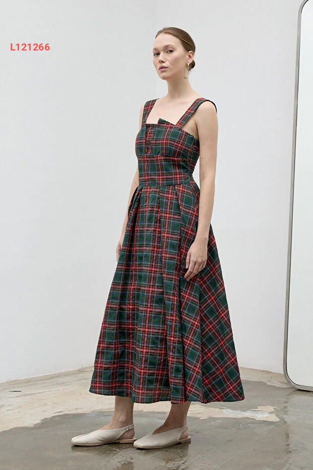 فستان طويل مزخرف بمربعات باللون الأخضر الداكن من مجموعة لاديا