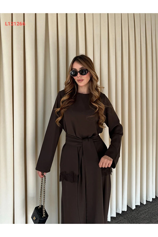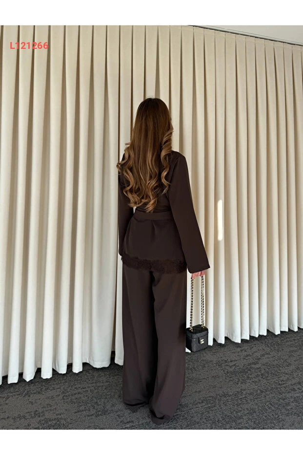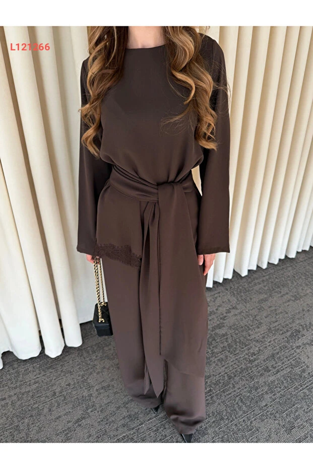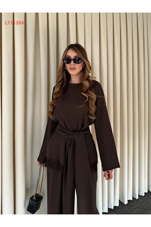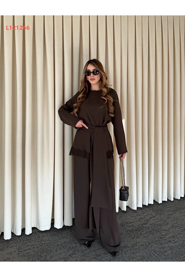 طقم بلايز وبنطلون دانتيل بأحزمة بني من لالوفيا - 8006