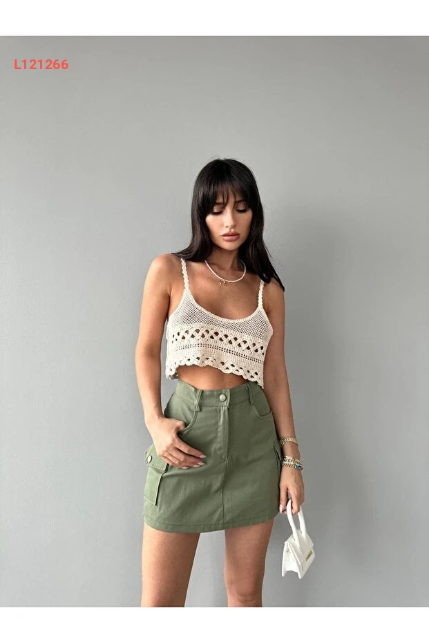 استمتعي بأناقة غير تقليدية مع تنورة LB Laluna Butik بخامة الكاكي المريحة، التي تجمع بين الجانب العملي والموضة العصرية. تأتي بتصميم قصير مزود بجيوب مريحة، مما يجعلها خيارًا مثاليًا لمختلف الإطلالات، سواء كانت يومية أو للمناسبات الخاصة. ارتديها مع قميص بسيط أو بلوزة أنيقة لتكملة إطلالتك المميزة!