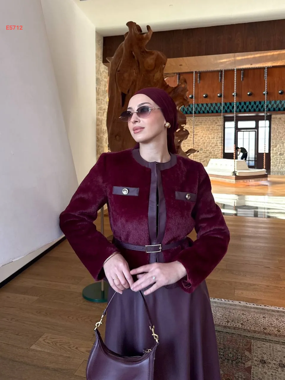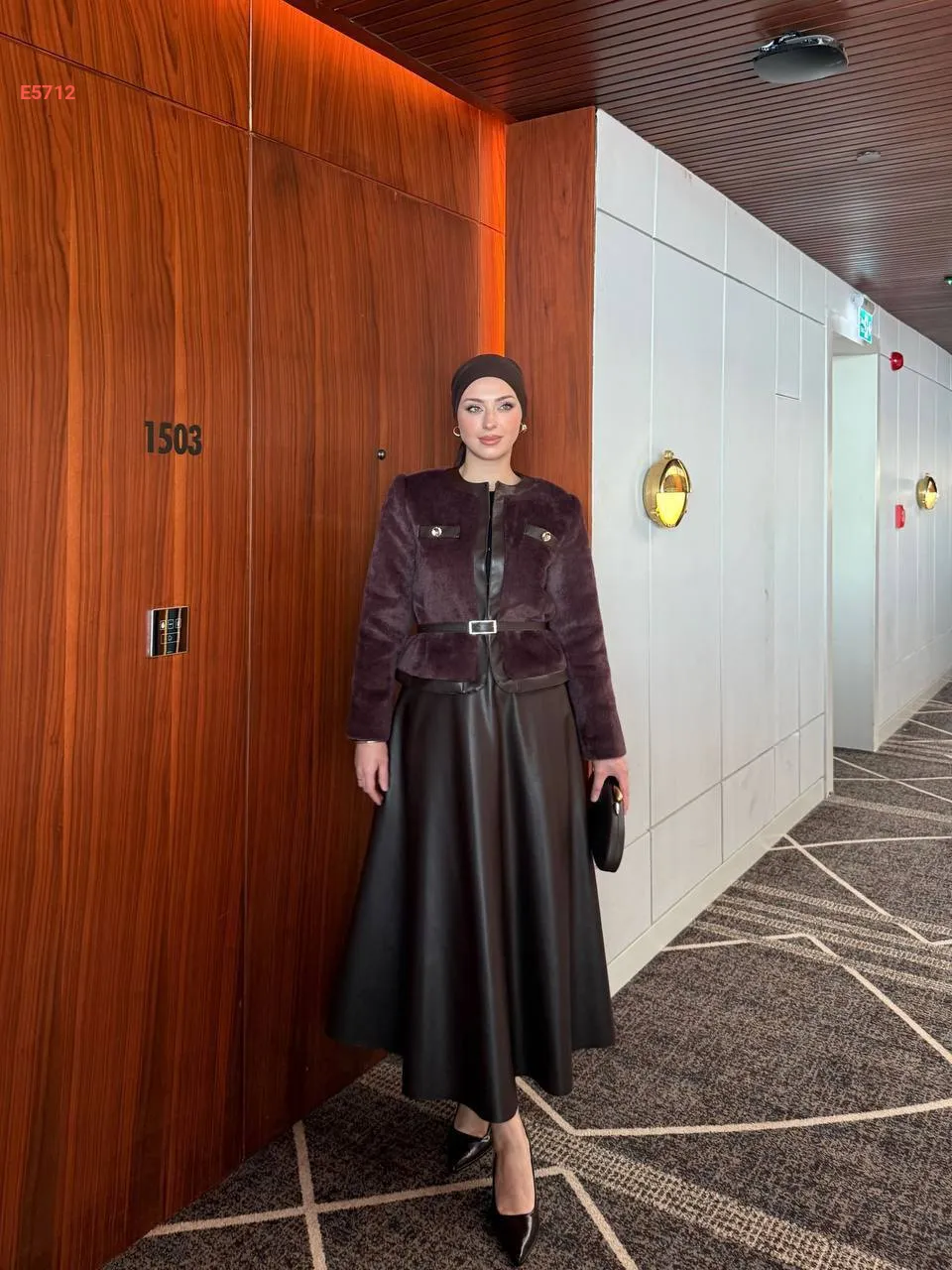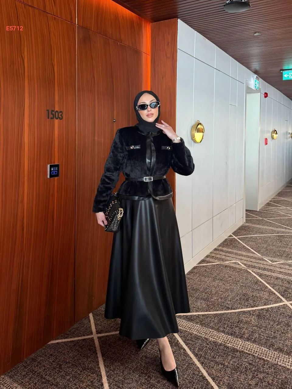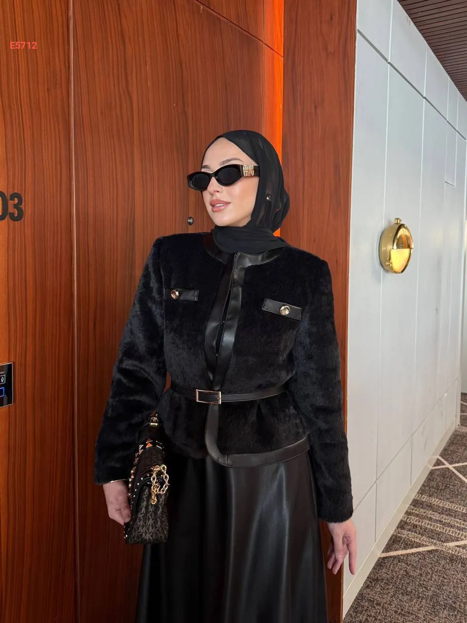 طقم تنورة جلد وجاكيت فرو بحزام