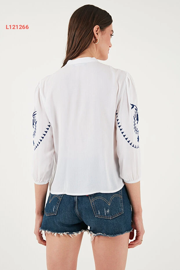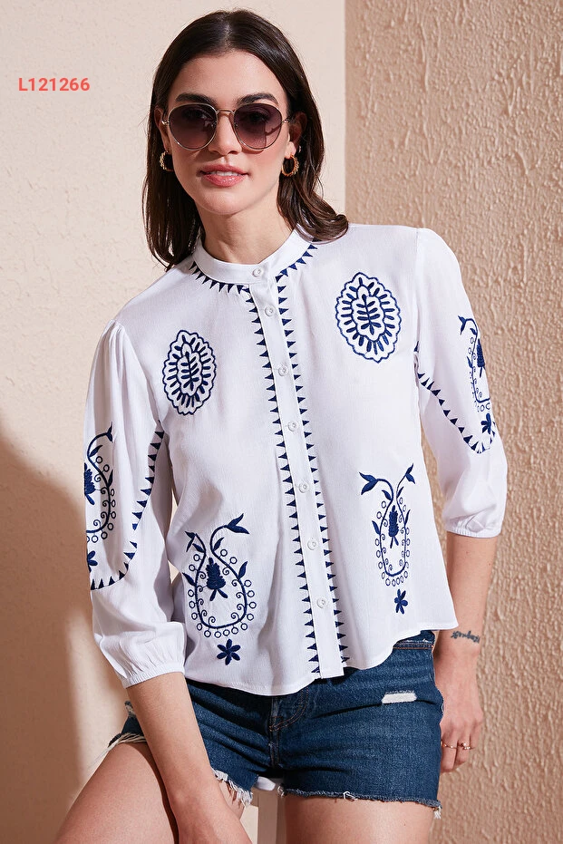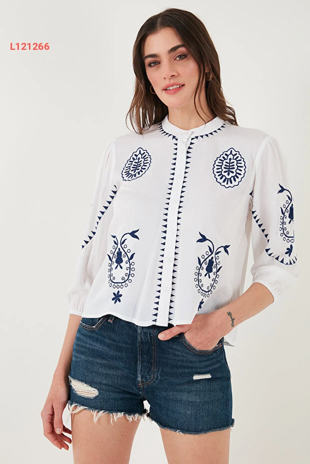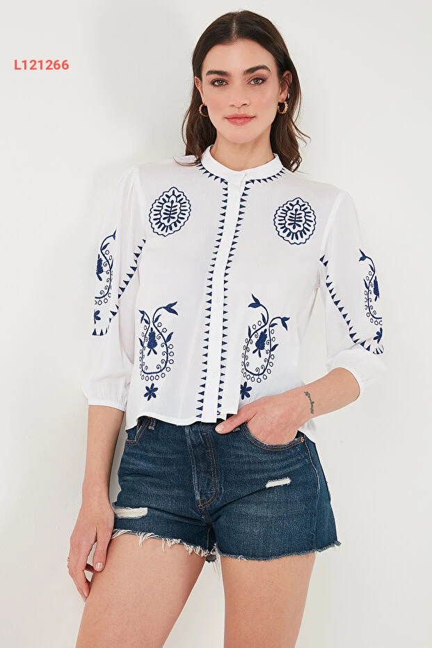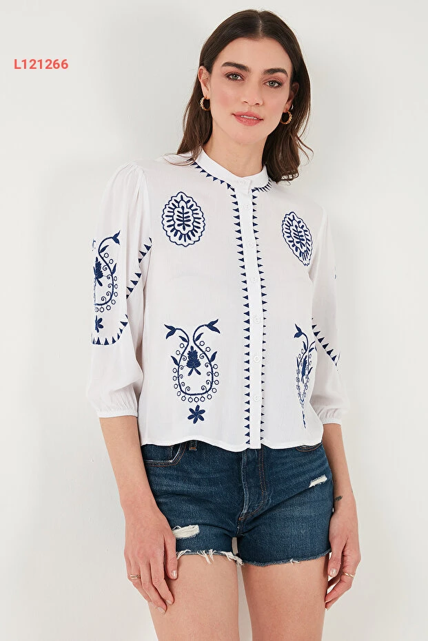 اكتشفي أناقة الصيف مع قميص "Lela" المطرز بأكمام قصيرة وياقة حاكم، Crafted من قماش شيله القطني الفاخر الذي يضمن لك الراحة والنعومة طوال اليوم. تصميمه العصري مع لمسات التطريز الفريدة يضيف لمسة أنثوية رائعة تناسب كل المناسبات، مما يجعله اختيارًا مثاليًا لمظهر أنيق وعصري.