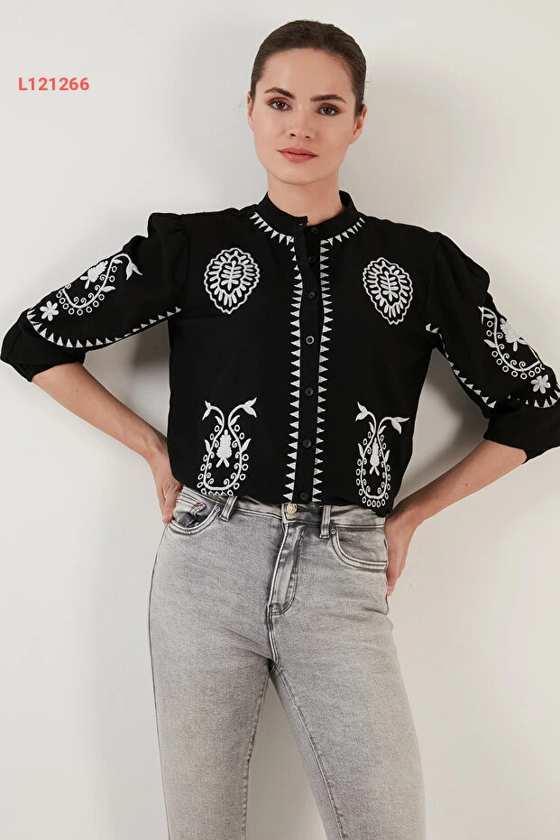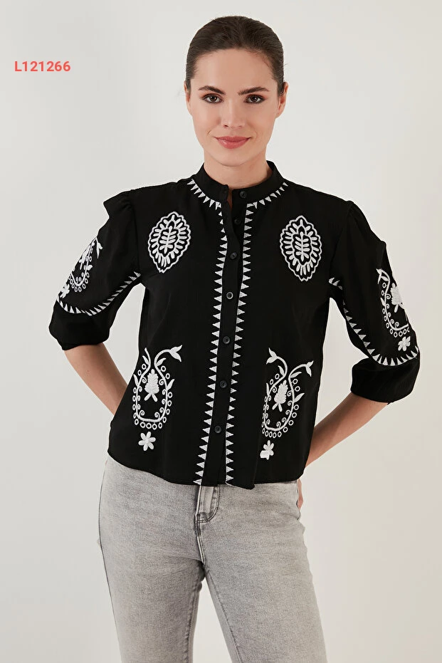 استمتع بالأناقة الفريدة مع قميص Lela المطرز بأكمام ترافعية وياقة حكيم، المصنوع من قماش شيل البيزي القطني المريح. تصميمه الجذاب يناسب جميع المناسبات، حيث يجمع بين الراحة والأناقة، ليمنحك إطلالة متميزة تعكس ذوقك الرفيع. ارتدي هذا القميص لإضافة لمسة فنية وجذابة إلى خزانة ملابسك!