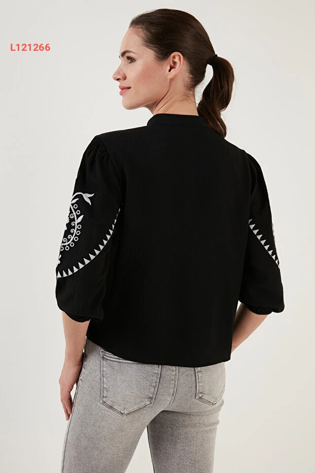 بلوزة ليلاء مطرزة بأكمام ثلاثية ويدين قماشي من قطن شيلّة