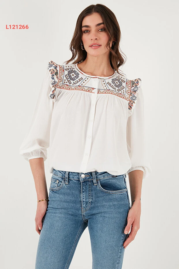 بلوزة ليلى بتصميم إتني مع تفاصيل الأكمام من قماش شيلبي