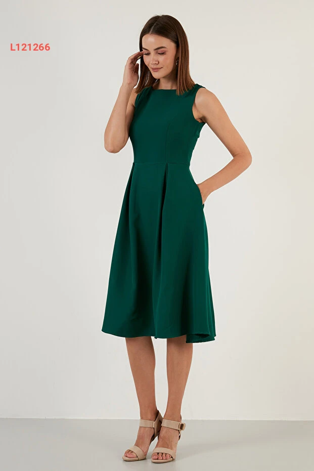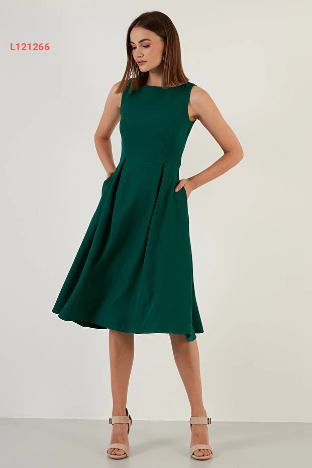 فستان Midi بجيوب وتصميم عادي بياقة دائرية من ليلّا