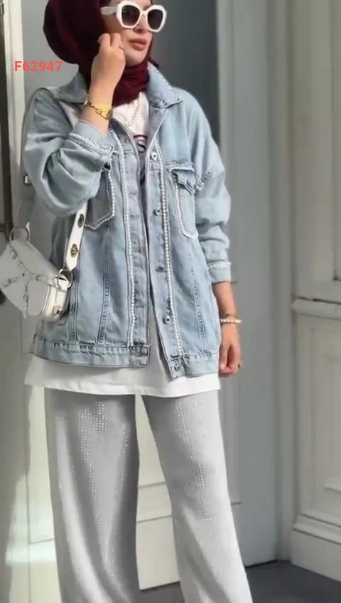 جاكيت جينز فاتح بتصميم عصري مزين بخطوط من اللؤلؤ الأنيق، يتميز بقصة واسعة تمنحك إطلالة "كاجوال"