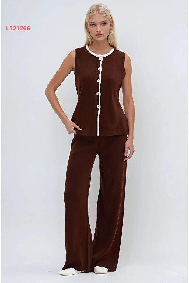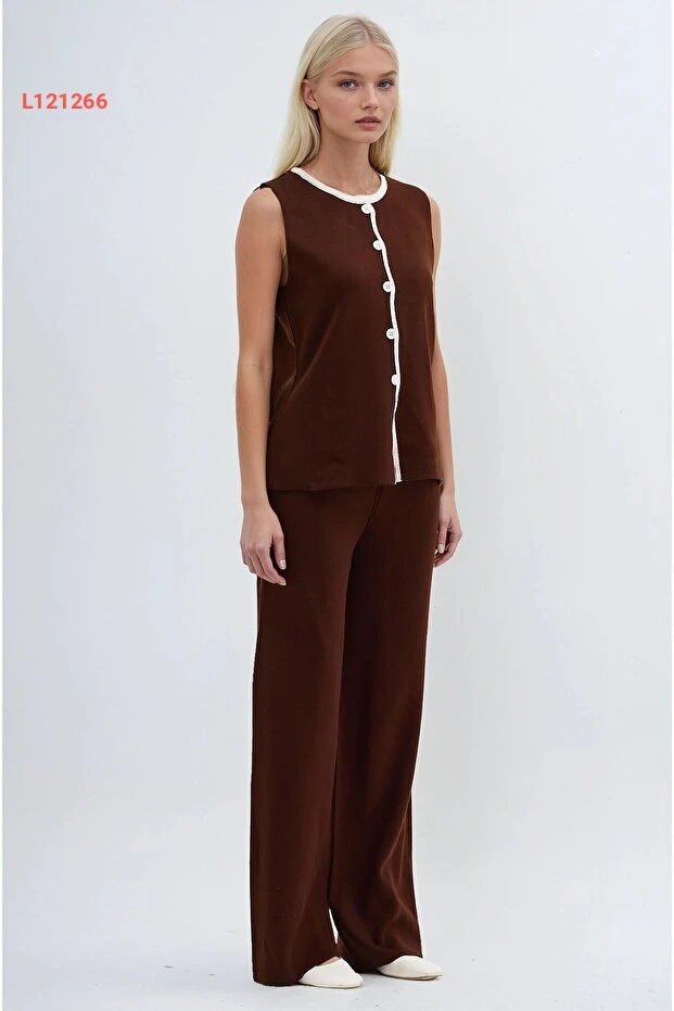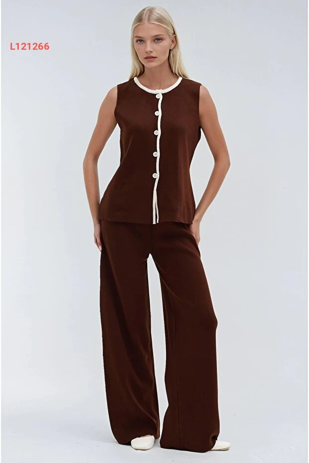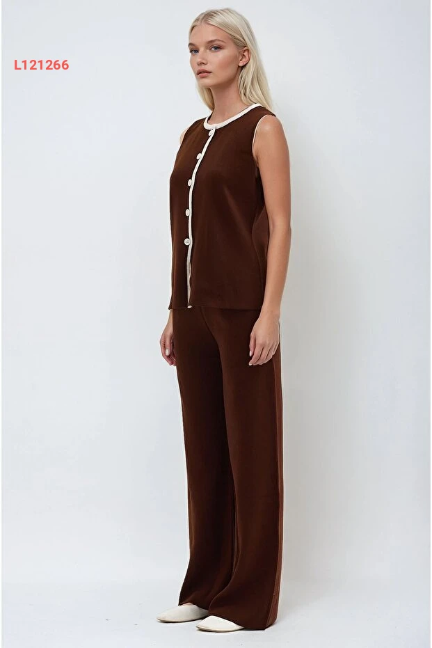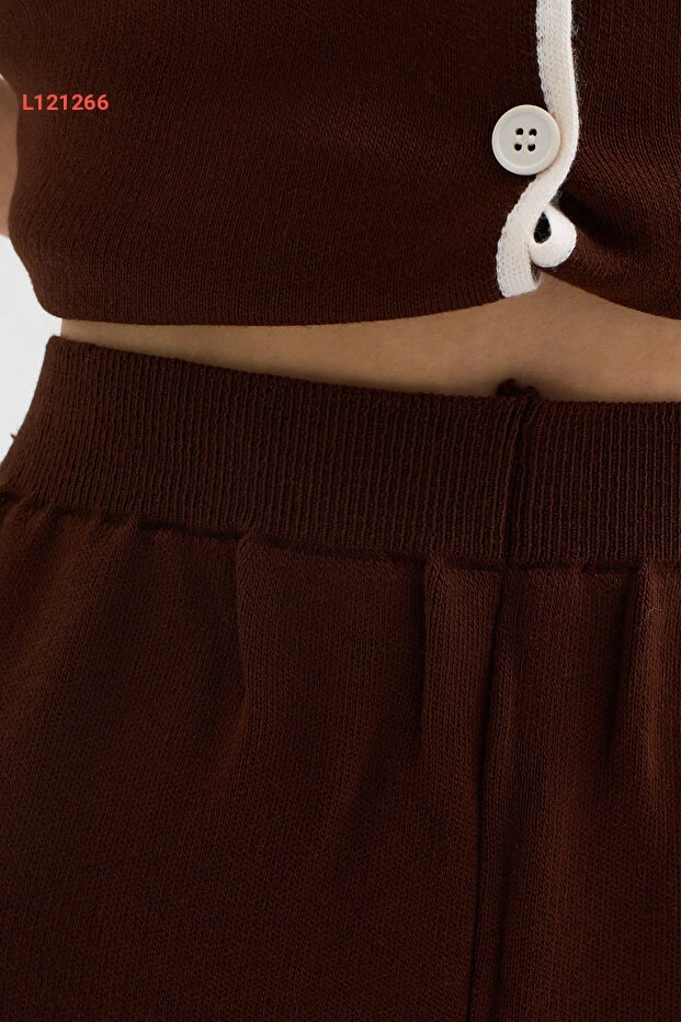 طقم تريكو مريح بياقة دائرية بلون بني مع تفاصيل خطية