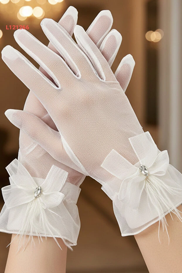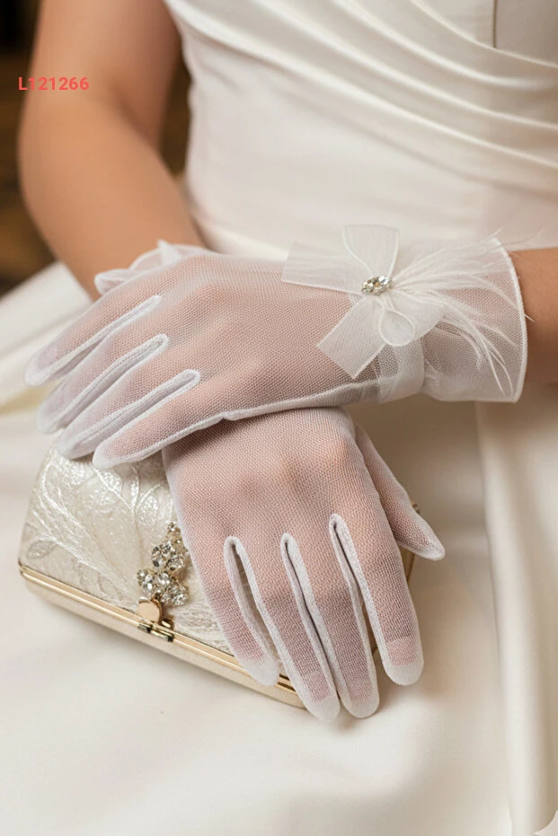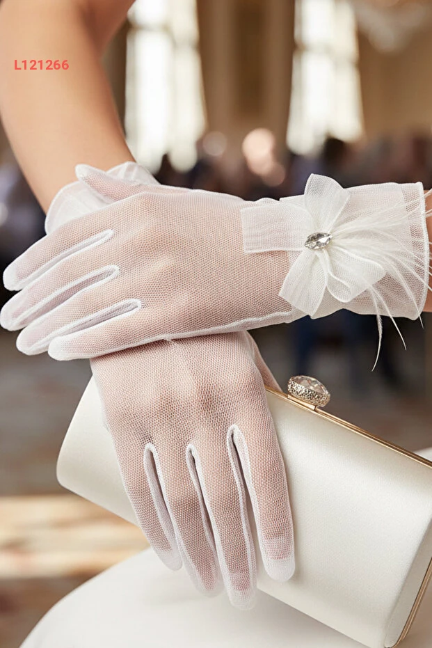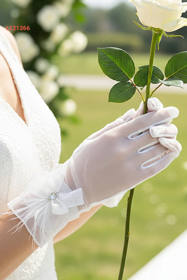 تألقي في يوم زفافك مع قفاز تيل ليمليا، المصنوع من قماش التيل الرقيق والمزين بتفاصيل رقيقة من الفيونك وحجر الماركيز. يتميز بتصميم أنيق يضيف لمسة من الفخامة والأنوثة، مما يجعلك محط الأنظار في كل لحظة من هذا اليوم السعيد. اختاري الأناقة والراحة مع قفازات تنضح سحراً وجاذبية.