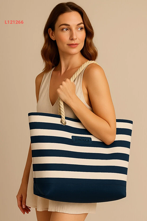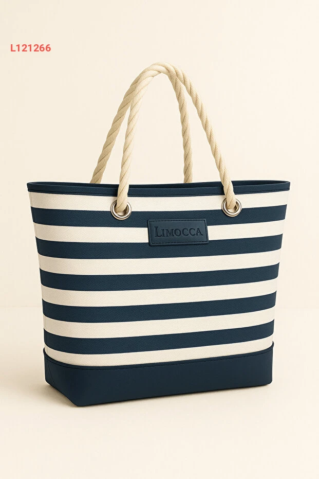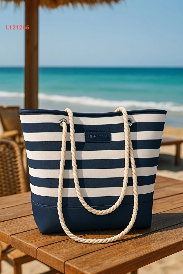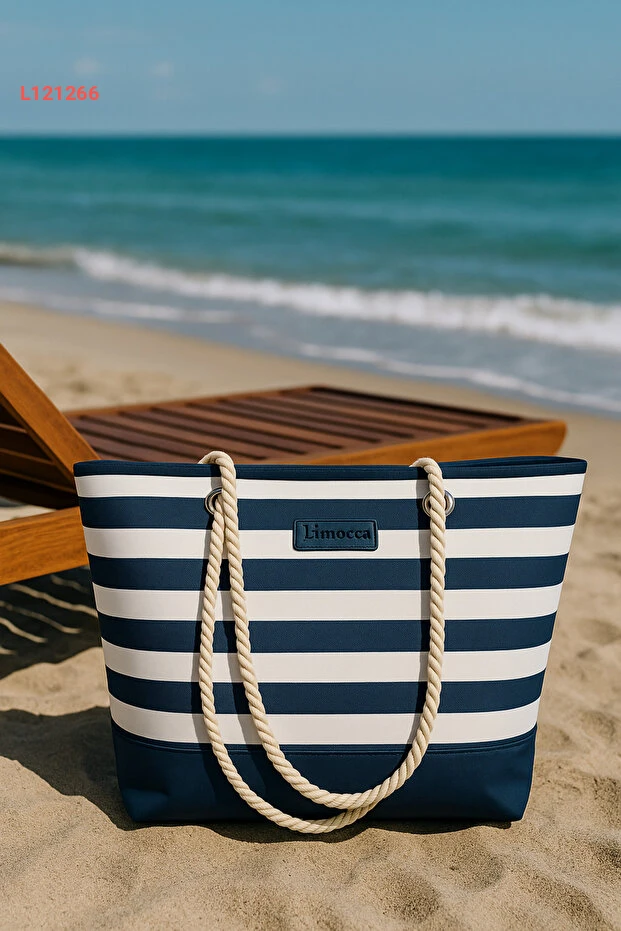 limocca home textile Kadın Plaj Çantası, Fermuarlı Çanta, Çizgili Halat İpli, Kadın Çantası, Cepli İç Astarlı